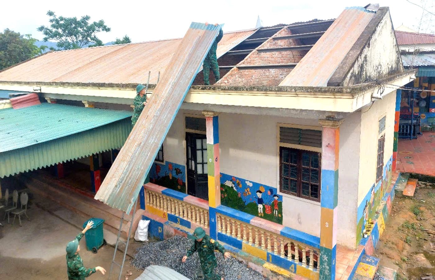 Tại trụ sở UBND xã, một phần mái phòng làm việc kiêm công vụ rộng khoảng 15m² cũng bị cuốn bay; nhiều vật dụng của cán bộ, công chức bị hư hỏng do mưa tạt.
