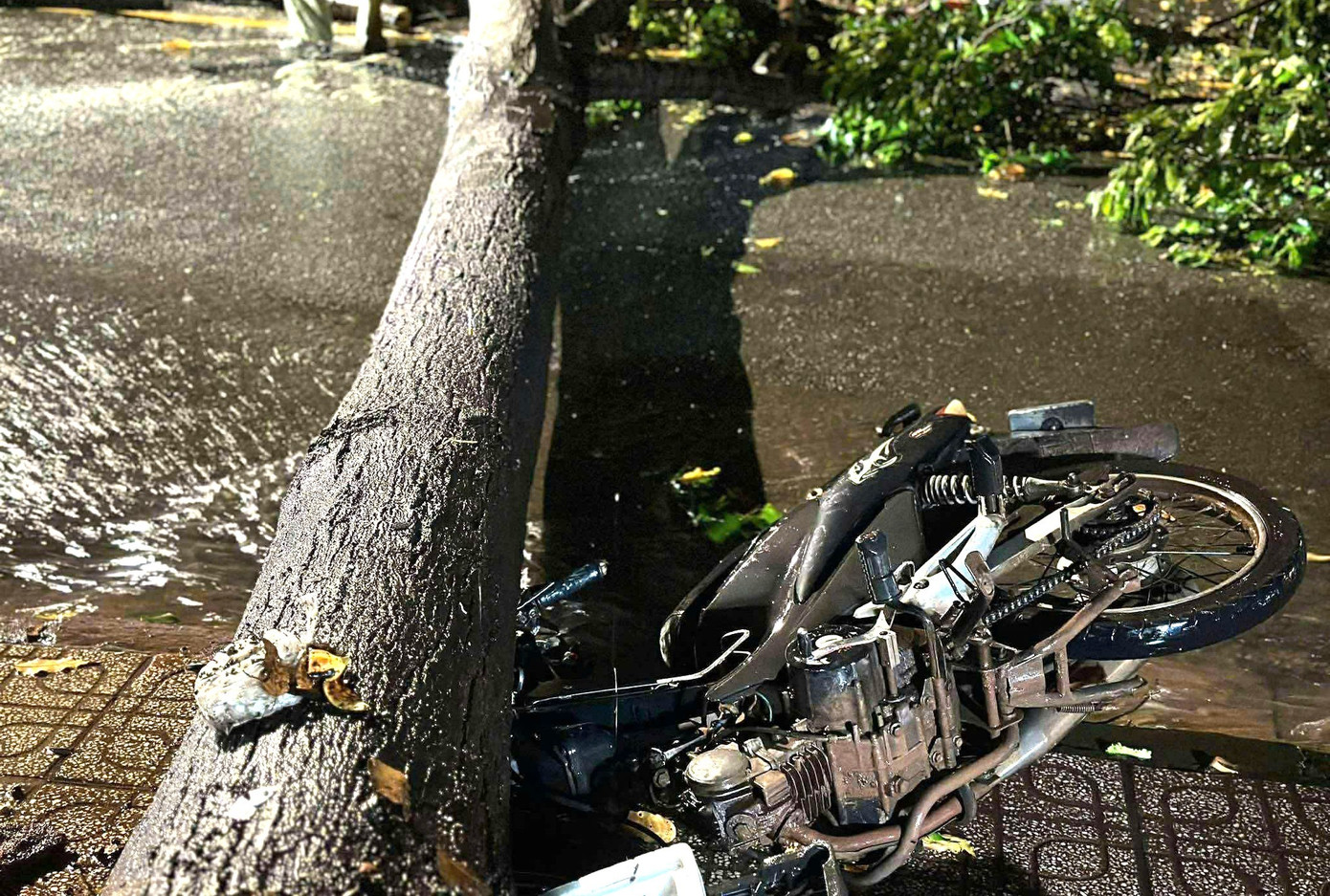 Chiếc xe máy bị cây xanh ngã đổ, đè bẹp
