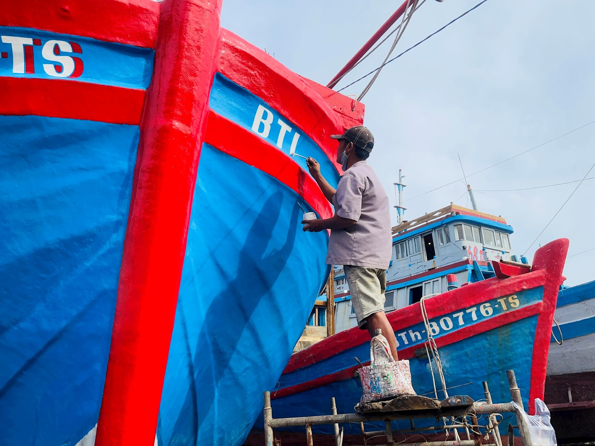 Tôi có mặt lúc 2 giờ chiều - thời điểm khu xưởng bước vào nhịp làm việc hối hả nhất trong ngày. Tiếng máy chà, tiếng gõ đục, tiếng người thợ gọi nhau hòa trong làn gió mát, tạo nên âm thanh nhịp nhàng đặc trưng của cao điểm “mùa tân trang” tàu thuyền. Trên thân một chiếc tàu lớn nằm nghiêng trên ụ, anh Phạm Thành Dũng (46 tuổi), có 22 năm trong nghề vẽ tàu, đang đứng vững vàng trên giàn giáo, tay thoăn thoắt quét từng đường sơn. Mùi sơn mới lẫn trong hơi gió nồng nặc nhưng anh làm việc đầy tập trung, từng nét như đang “viết” lên câu chuyện của con tàu.