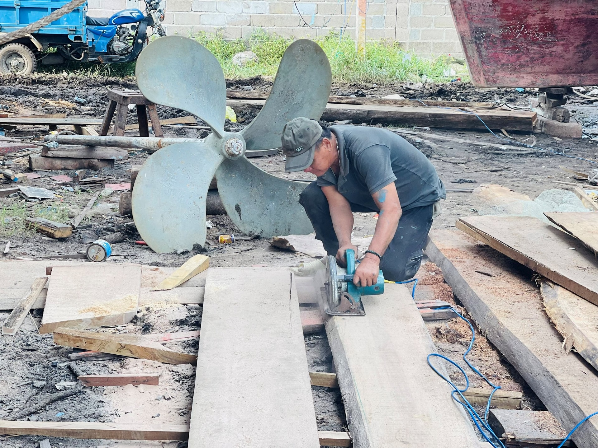 Đến gần 4 giờ chiều, ánh nắng vàng trải xuống khắp khu sửa chữa tàu thuyền Phú Hài. Ở góc bên kia, tôi gặp anh Trang Nhì (SN 1964, quê ở Quảng Nam cũ), người có 40 năm gắn bó với nghề sửa tàu thuyền. Tay anh sạm đen, chai cứng vì dầu máy và nắng gió. Động tác của anh khi nạy một tấm ván cũ vừa dứt khoát vừa nhẹ nhàng, chuẩn xác đến mức thợ trẻ đứng gần đó cũng lặng im quan sát. “Tôi làm nghề này từ hồi còn nhỏ xíu. Ai kêu gì thì làm nấy, học từ cái đục, cái cưa mà thành quen. Ở đây toàn học nghề vậy thôi chứ đâu ai có bằng cấp gì”, anh Nhì nói bằng giọng Quảng hiền và trầm.