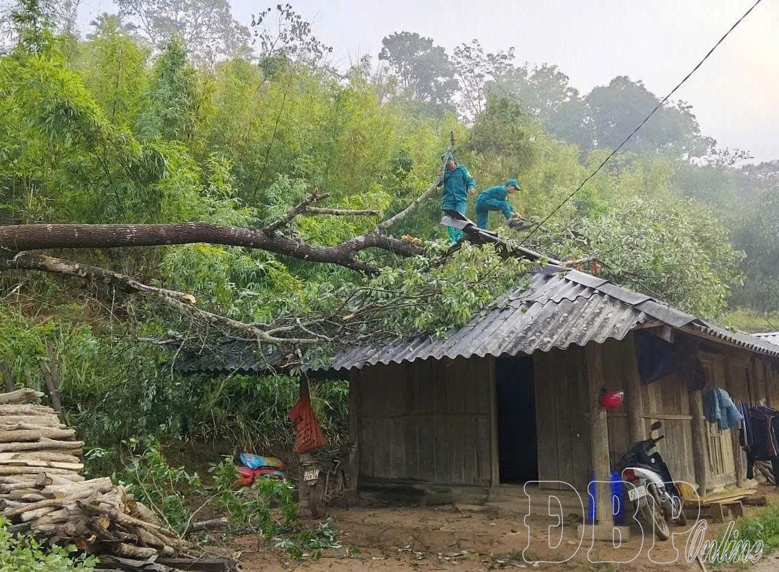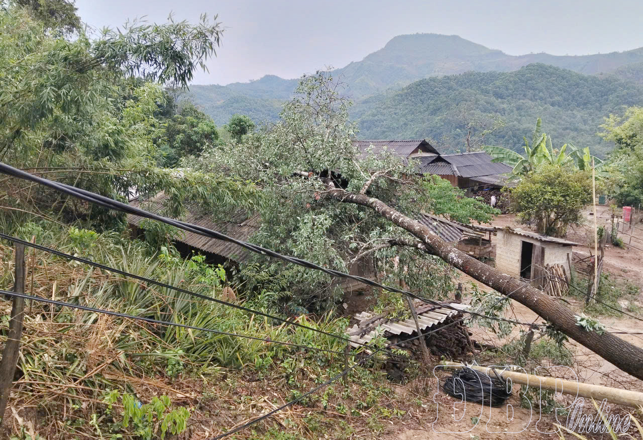 Mưa lớn kèm giông lốc khiến cây gãy đổ vào đường điện và làm hư hỏng nhà dân.