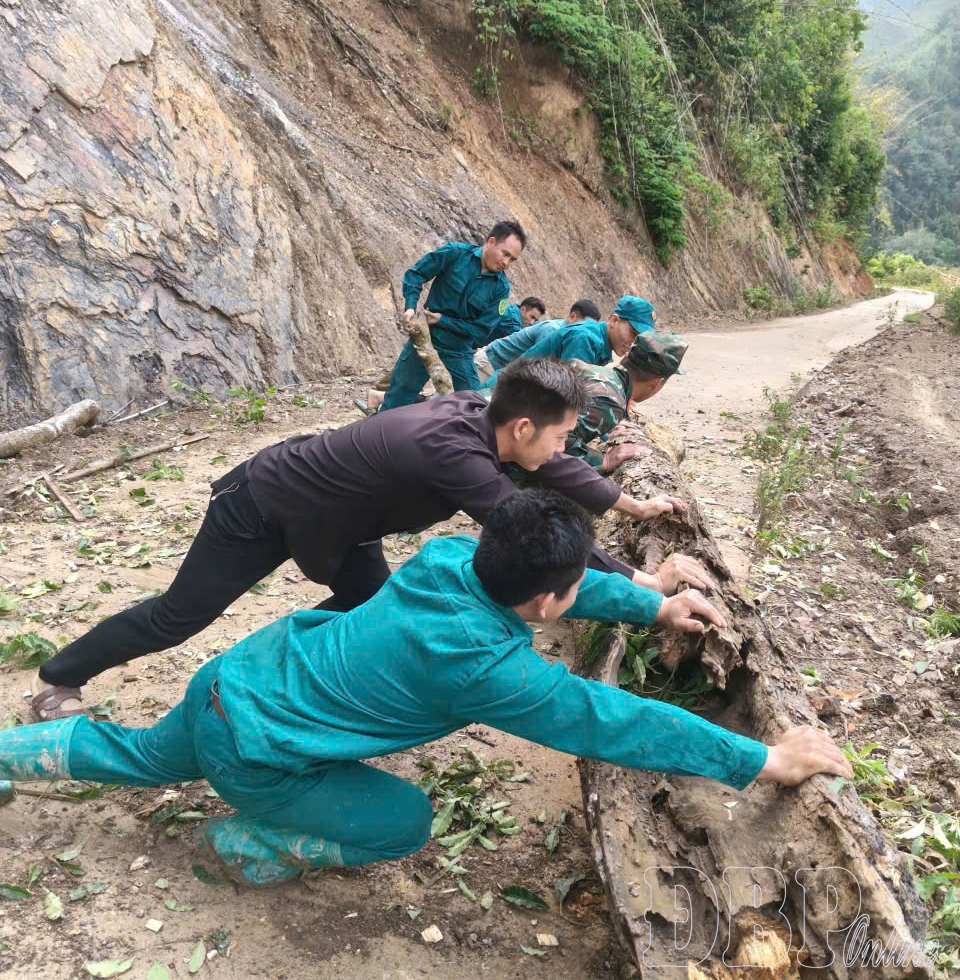 Ban Chỉ huy Phòng thủ dân sự xã Phình Giàng khắc phục, đảm bảo giao thông sau trận mưa giông kèm lốc xoáy.