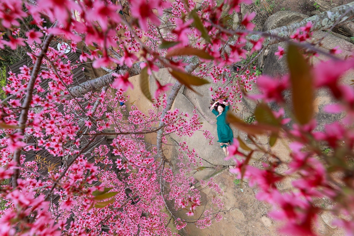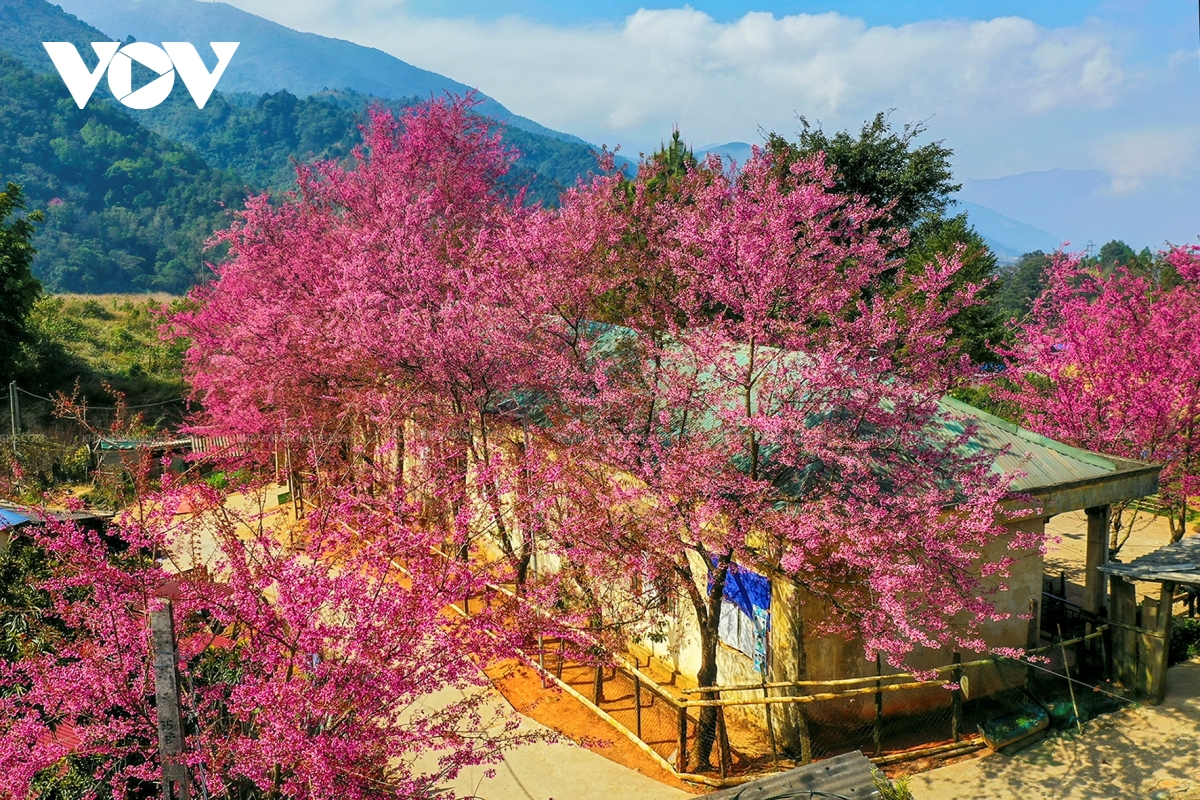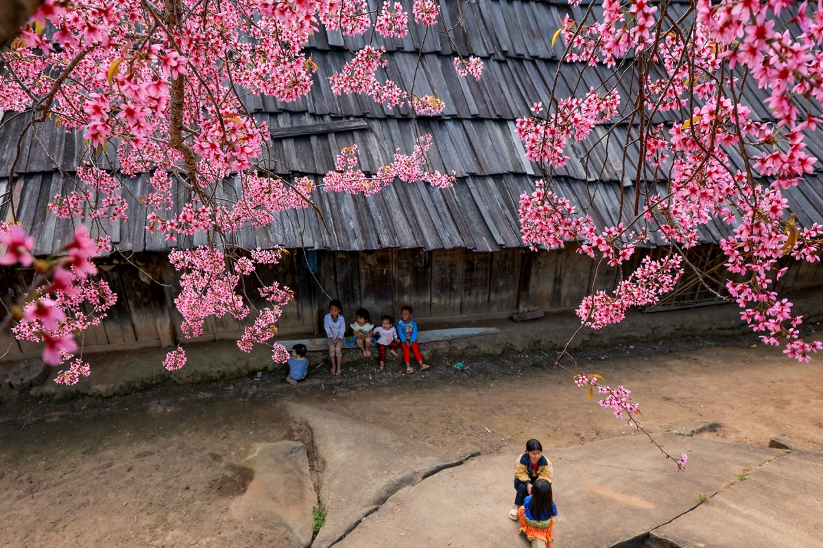 Những hàng cây hoa anh đào được trồng nhiều nhất ở trường tiểu học Mường Típ 1 - điểm trường Phà Nọi và dọc ngay lối vào bản. Hoa anh đào ở đây nở vào khoảng tháng 1 đến tháng 2 dương lịch, với sắc hồng rực rỡ, tạo nên khung cảnh lãng mạn. (Ảnh: Sách Nguyễn).
