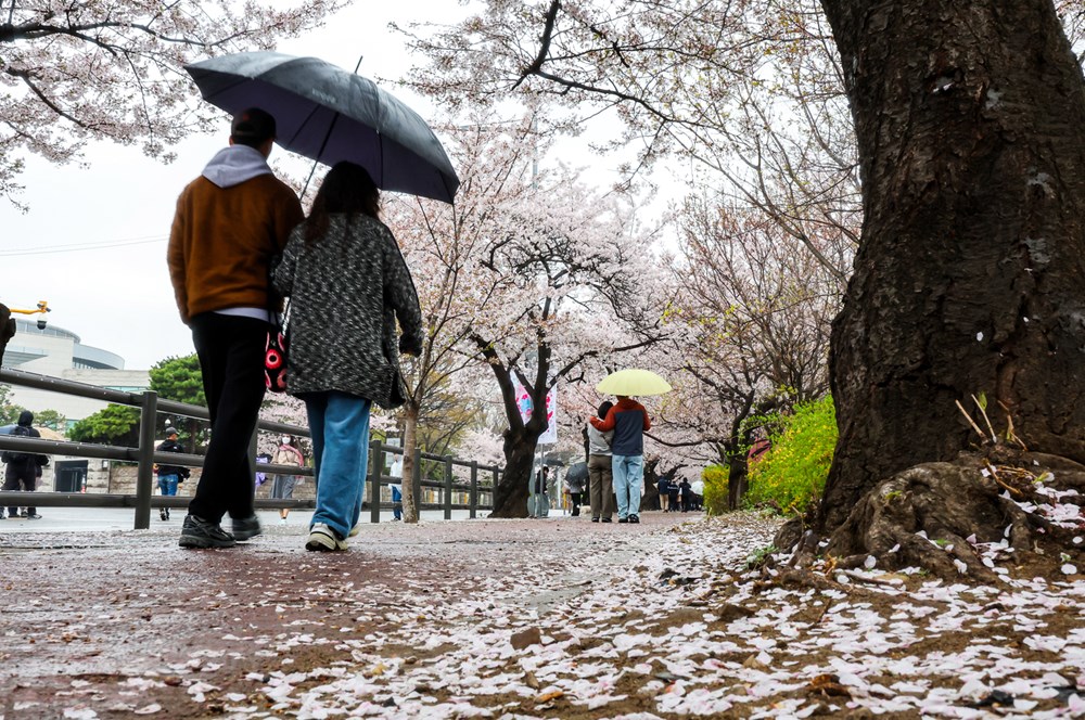 Tại Hàn Quốc, diễn biến mùa hoa năm nay còn rõ rệt hơn. Theo Korea JoongAng Daily, mưa lớn kèm gió mạnh trong tuần này đã khiến hoa rụng nhanh, làm mùa ngắm hoa kết thúc sớm hơn dự kiến.