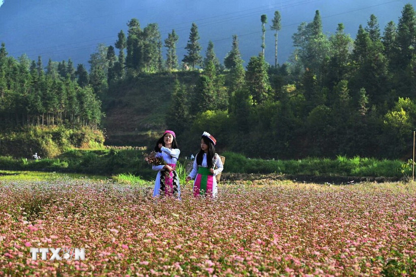 Nét hồn nhiên của hai thiếu nữ Mông khi dạo bước trên cánh đồng Tam giác mạch ở Đồng Văn. (Ảnh: Minh Tâm/TTXVN)