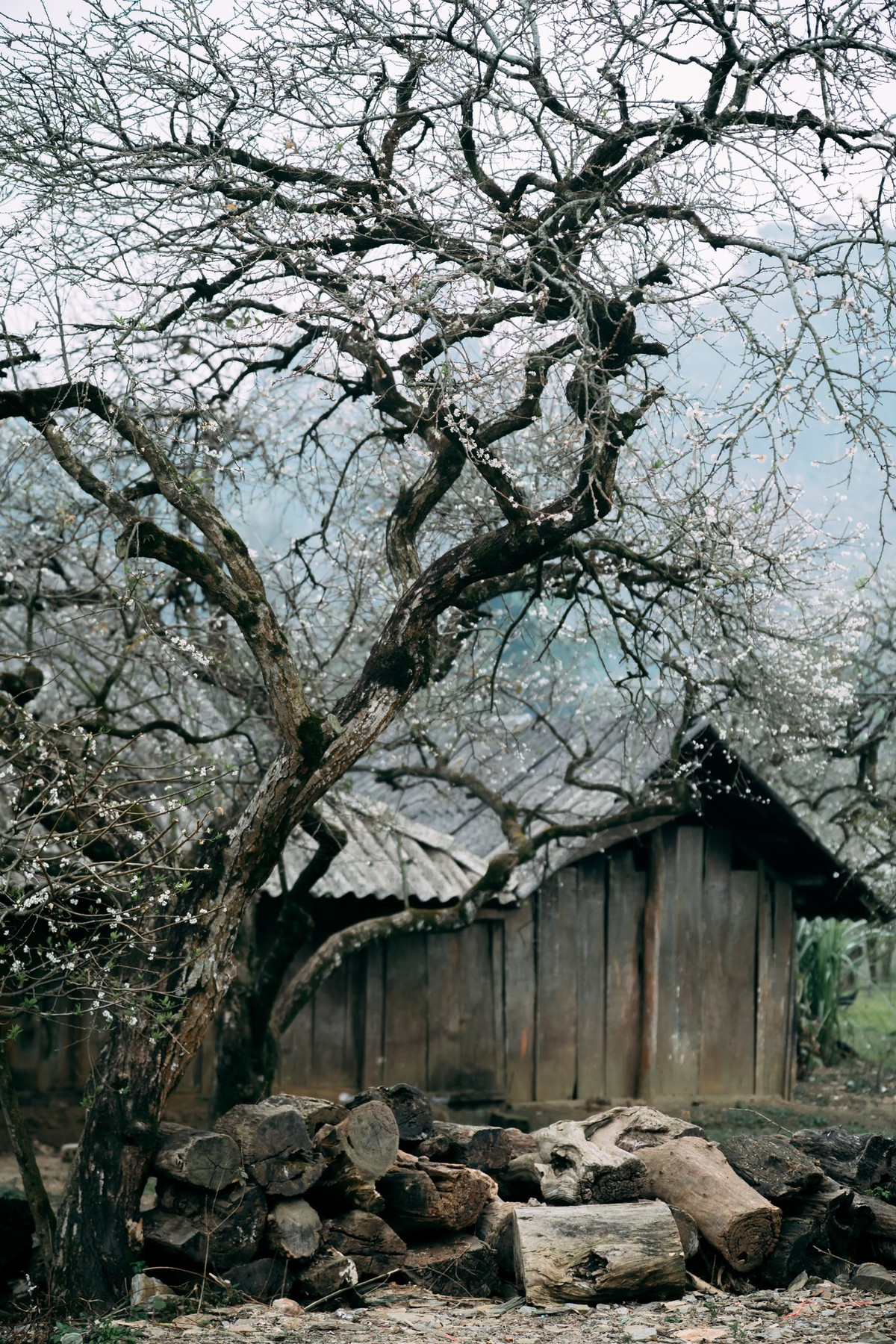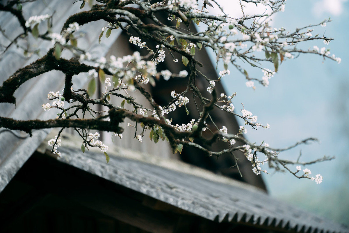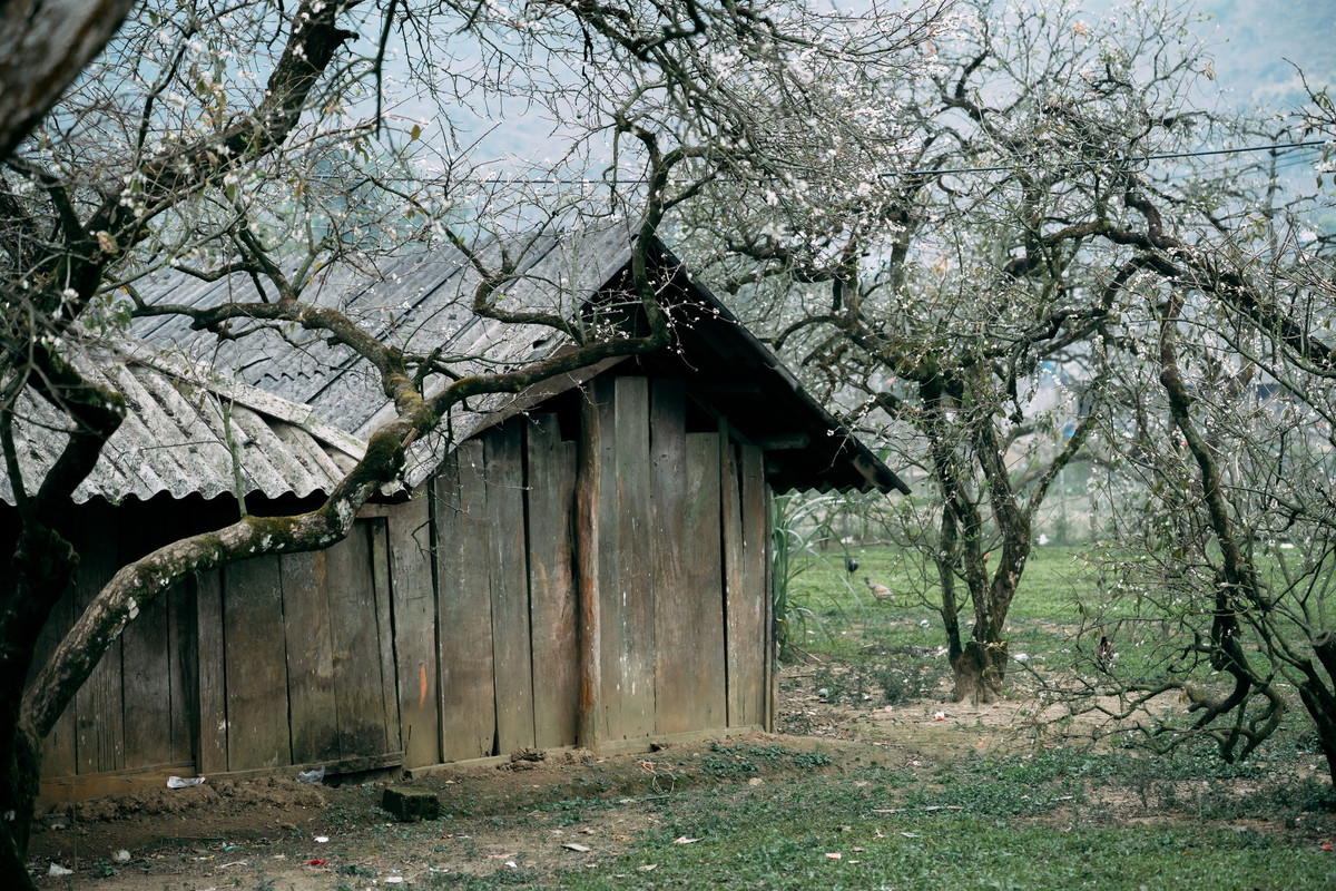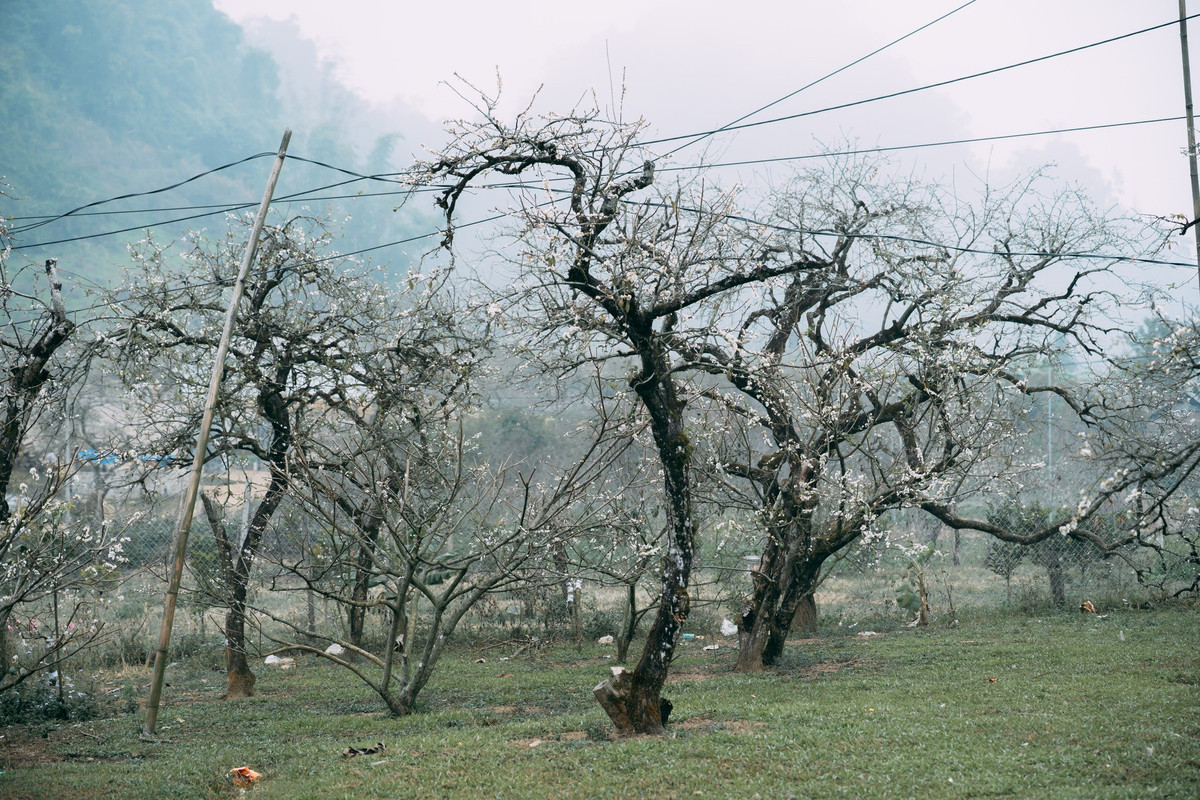 Hoa mận ở đây không rực rỡ sắc màu mà mang vẻ đẹp tinh khôi, thuần khiết. Những cánh hoa trắng nhỏ xếp chồng lên nhau, nổi bật trên nền trời xanh nhạt và núi đồi trập trùng, khiến khung cảnh tựa như một thước phim điện ảnh.