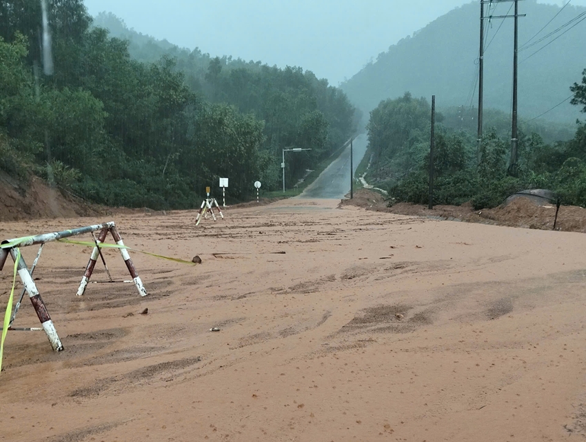 Mưa lớn cuốn theo một lượng đất đá tràn xuống đường. Ảnh: UBND xã Chân Mây - Lăng Cô