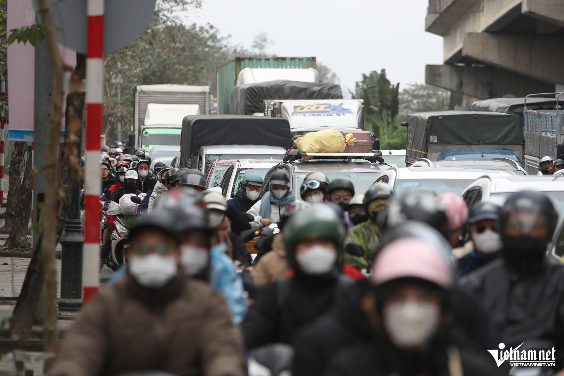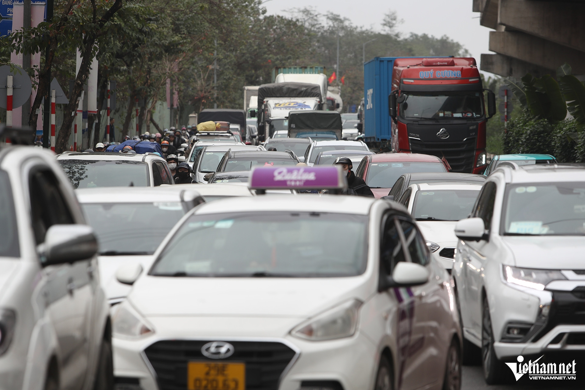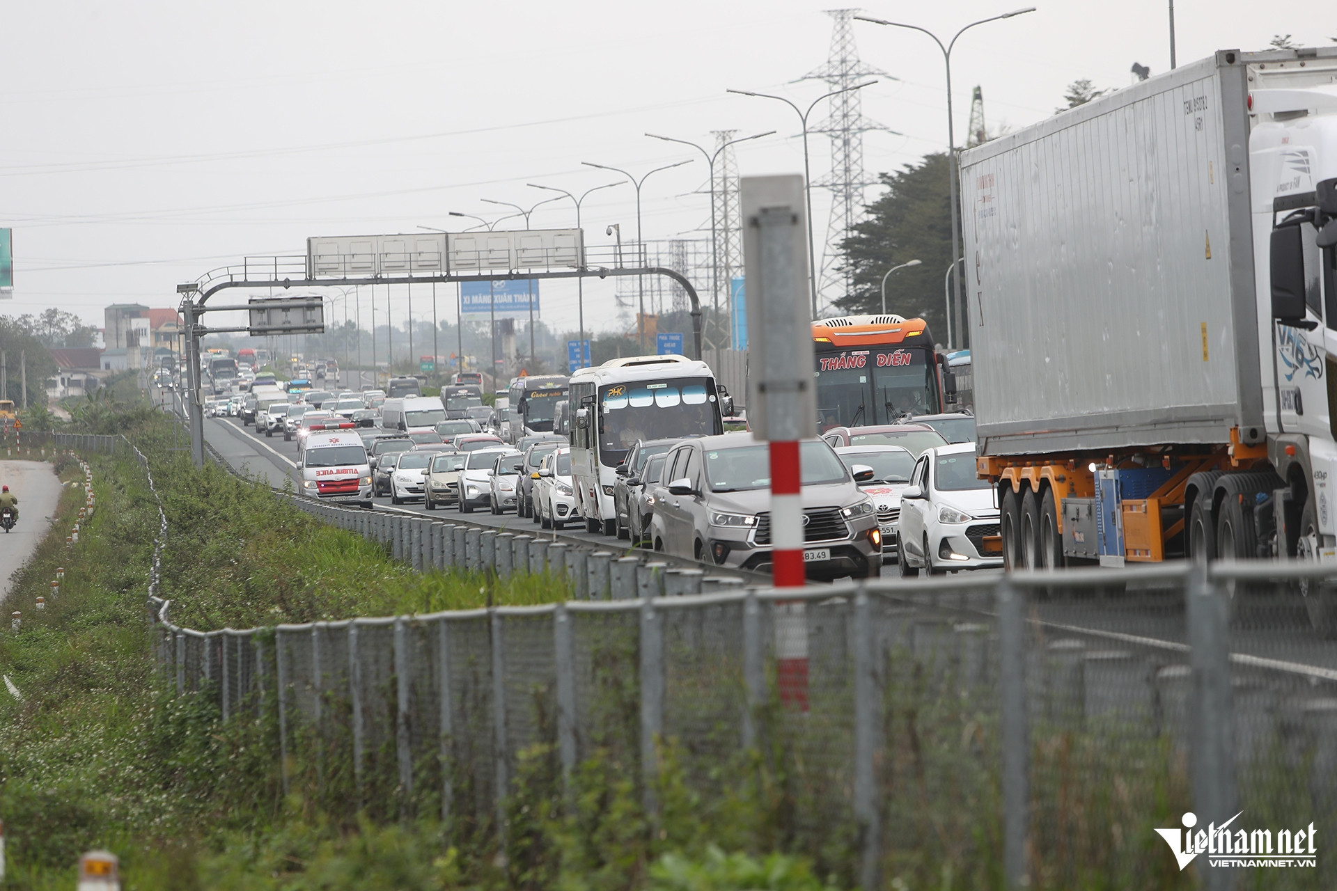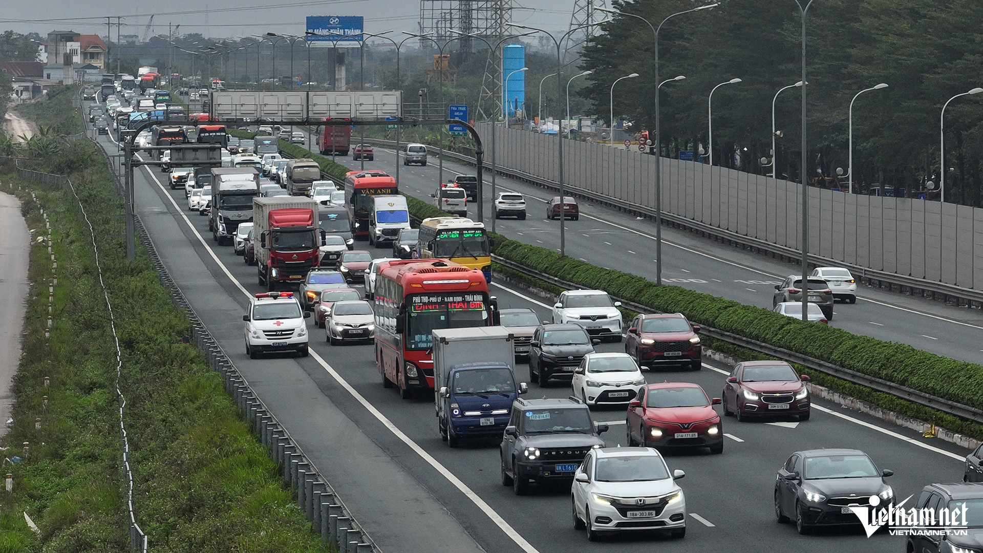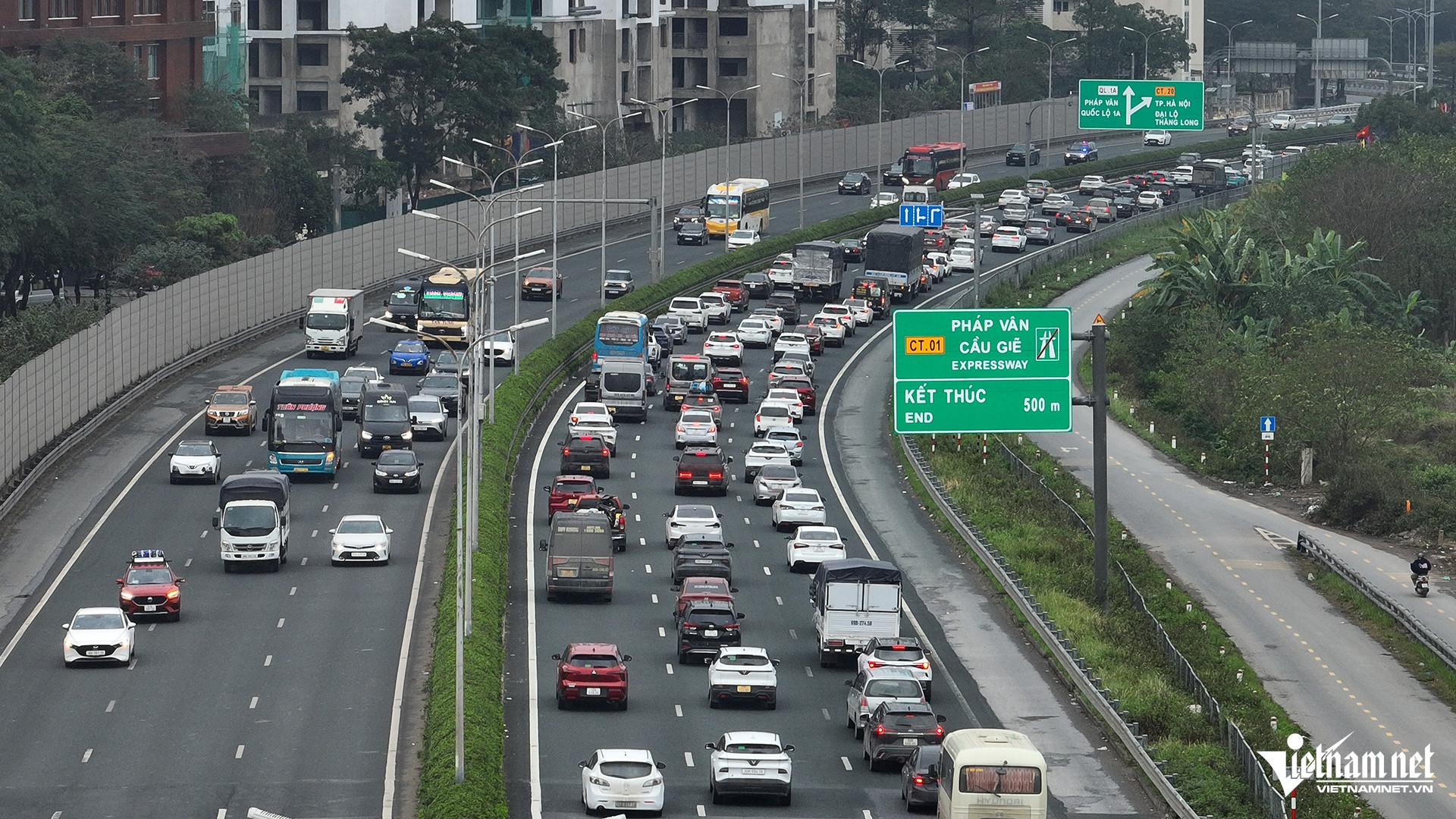 Từ 14h, lưu lượng phương tiện dồn về điểm cuối cao tốc Pháp Vân - Cầu Giẽ (đoạn qua phường Yên Sở, Hà Nội) tăng đột biến.
