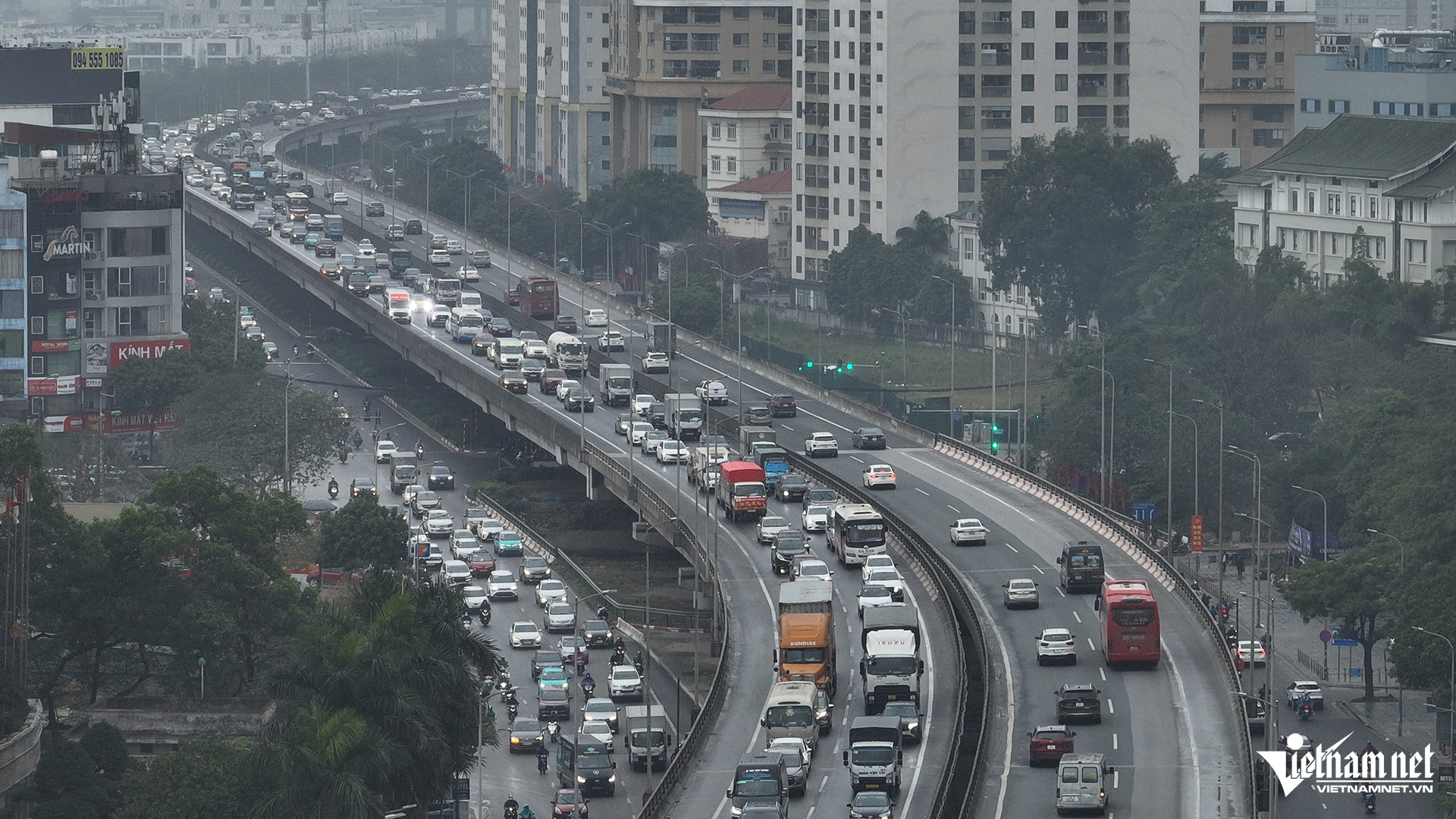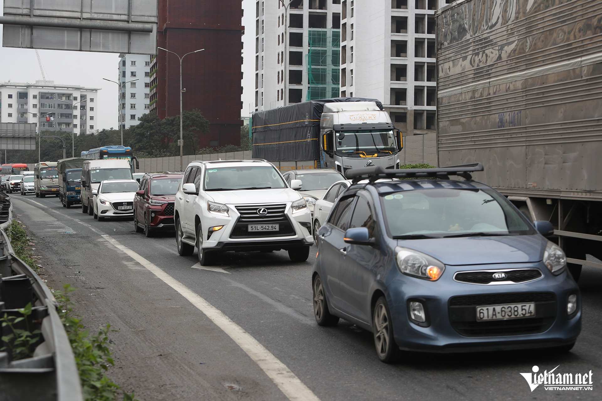 Tình trạng ùn tắc cục bộ cũng xảy ra tại Vành đai 3 trên cao (đoạn qua hồ Linh Đàm, Hà Nội), dòng ô tô chỉ có thể đi từ 20-30km/h.