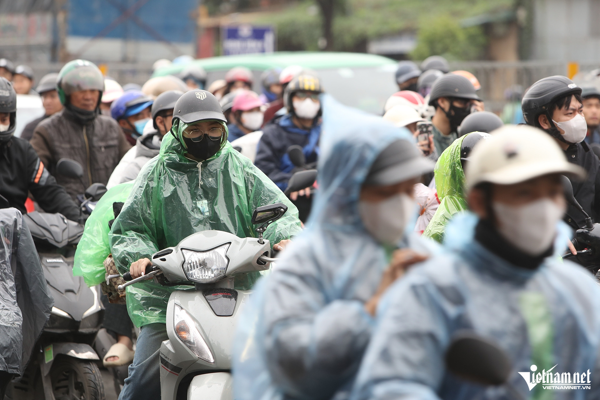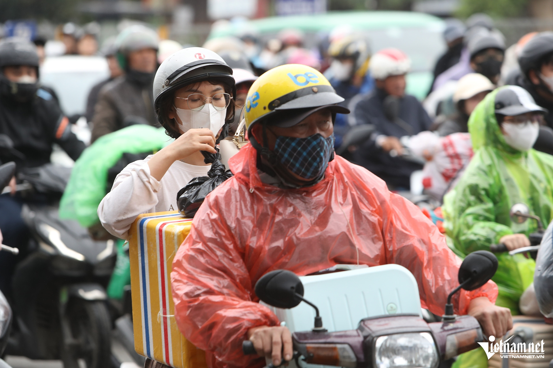 Trong cơn mưa nhỏ, người dân lỉnh kỉnh đồ đạc, chật vật trở lại thành phố