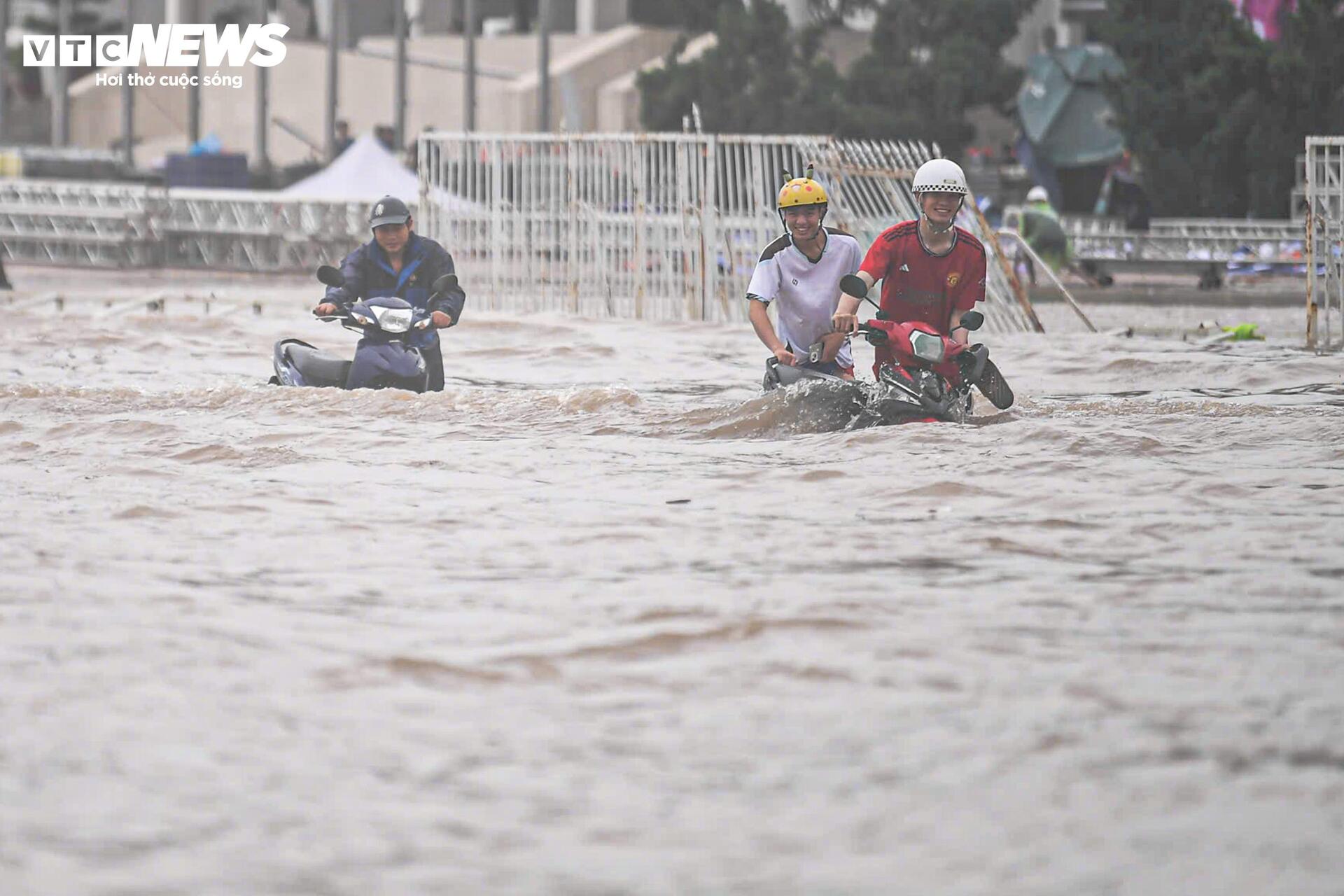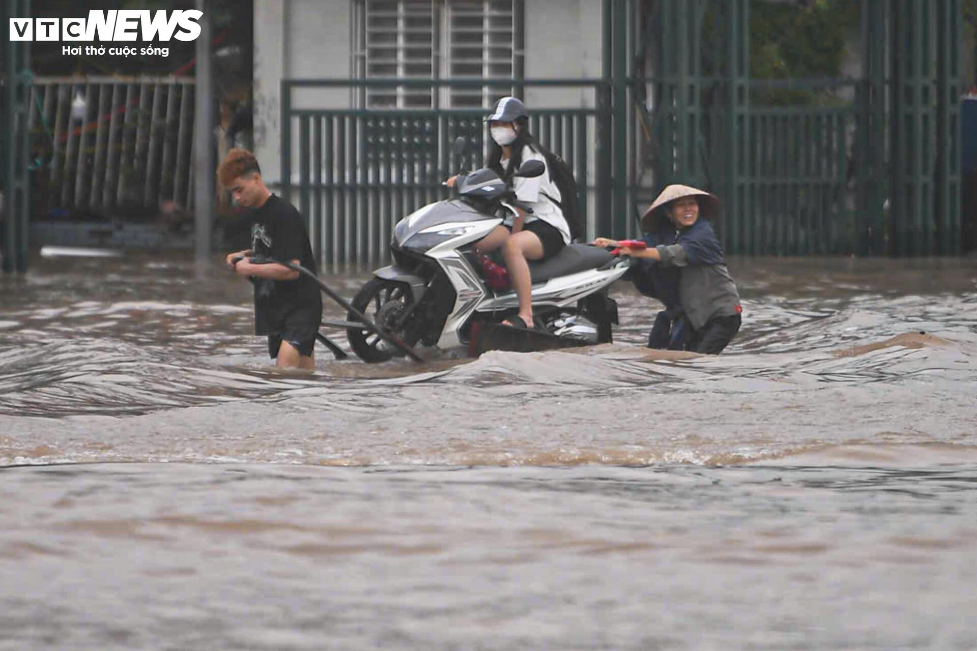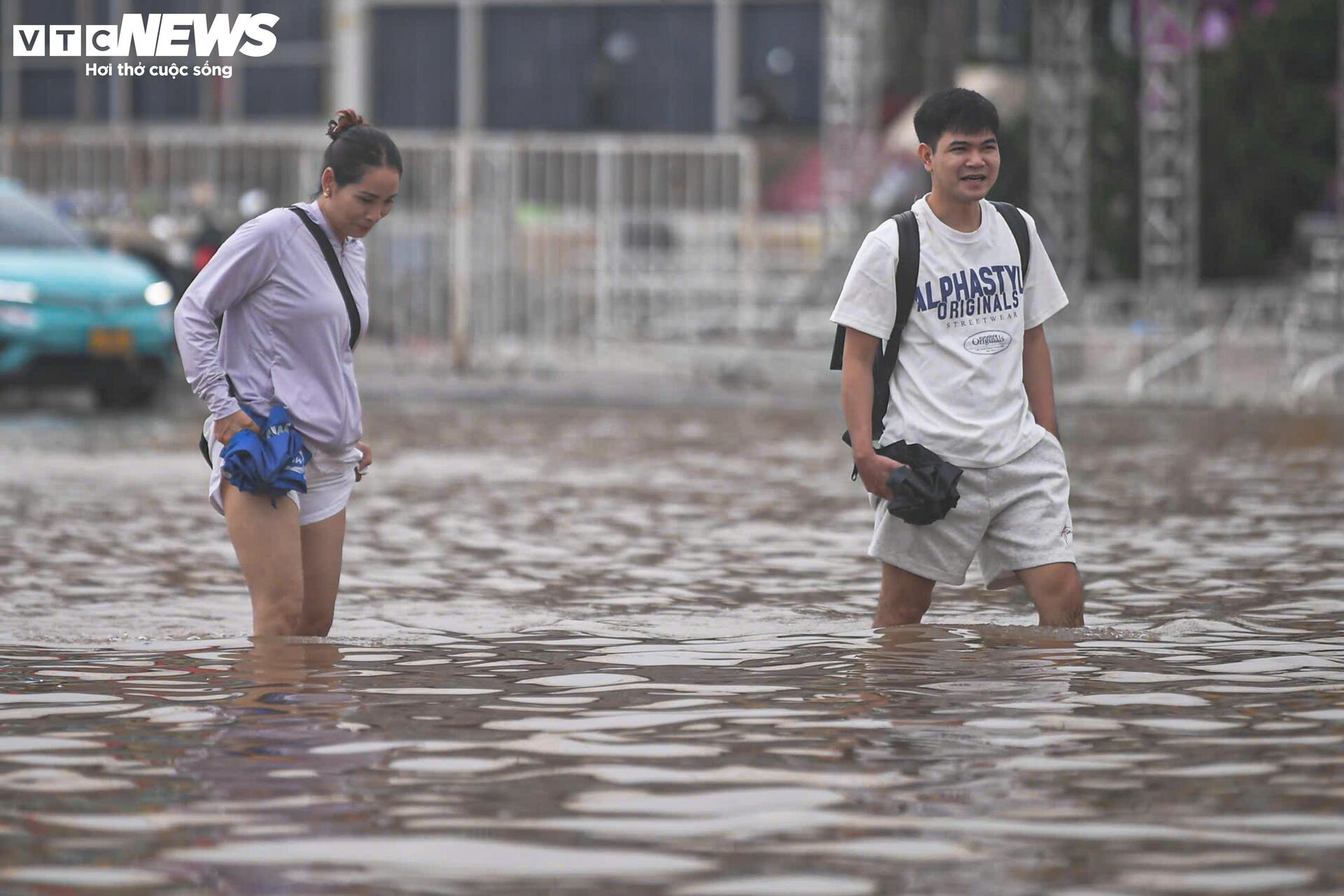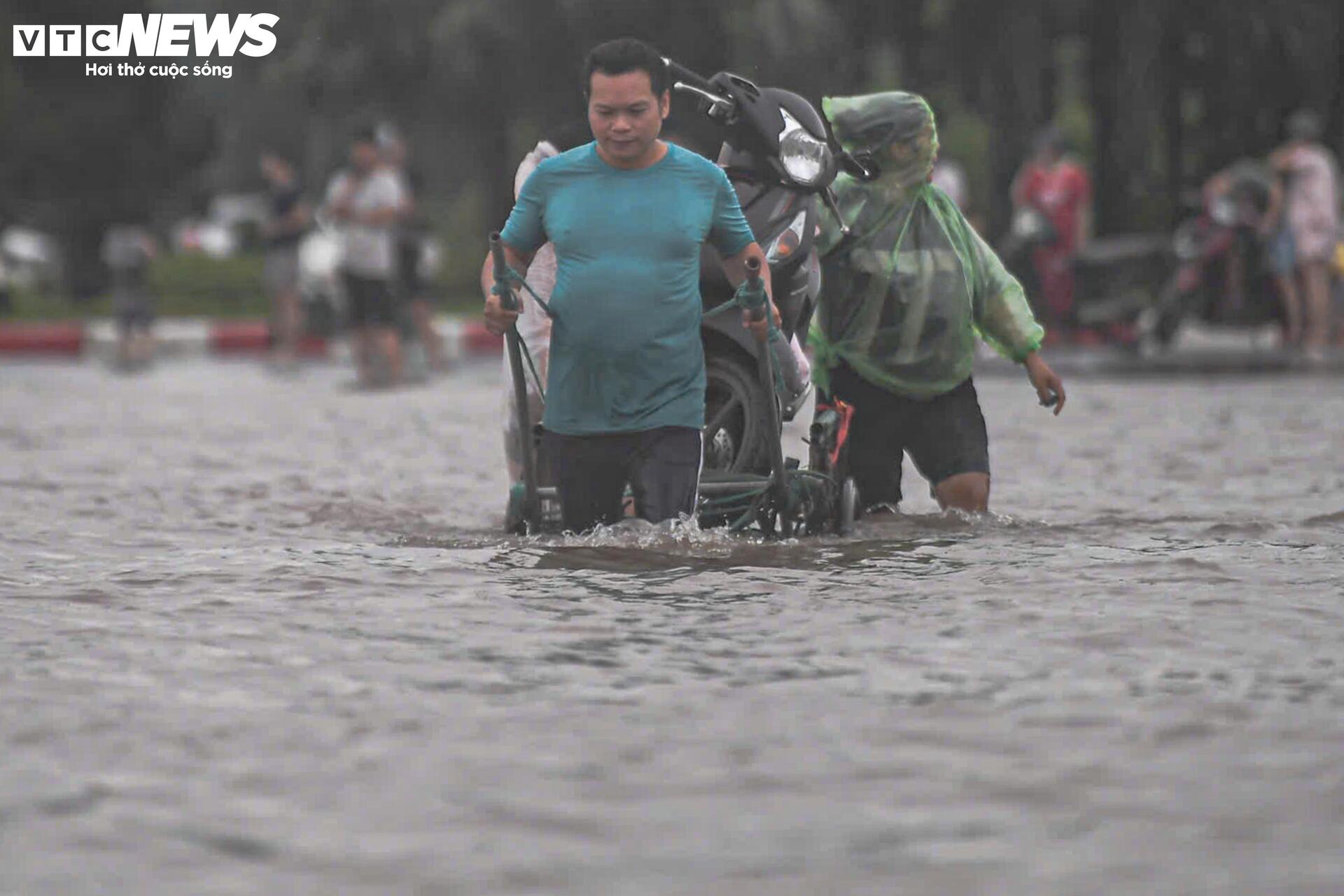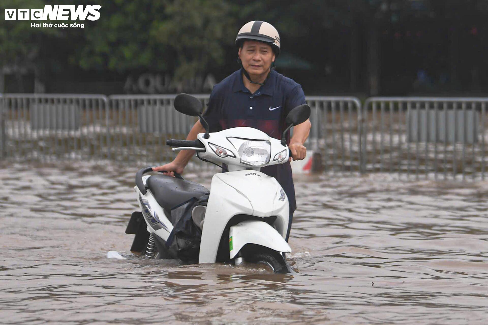 Nước mưa dâng cao ngập quá bánh xe, nhiều người đi xe máy buộc phải dắt bộ, bì bõm lội nước để tìm đường thoát. Một số xe ô tô chết máy giữa đường, phải chờ cứu hộ đến hỗ trợ.