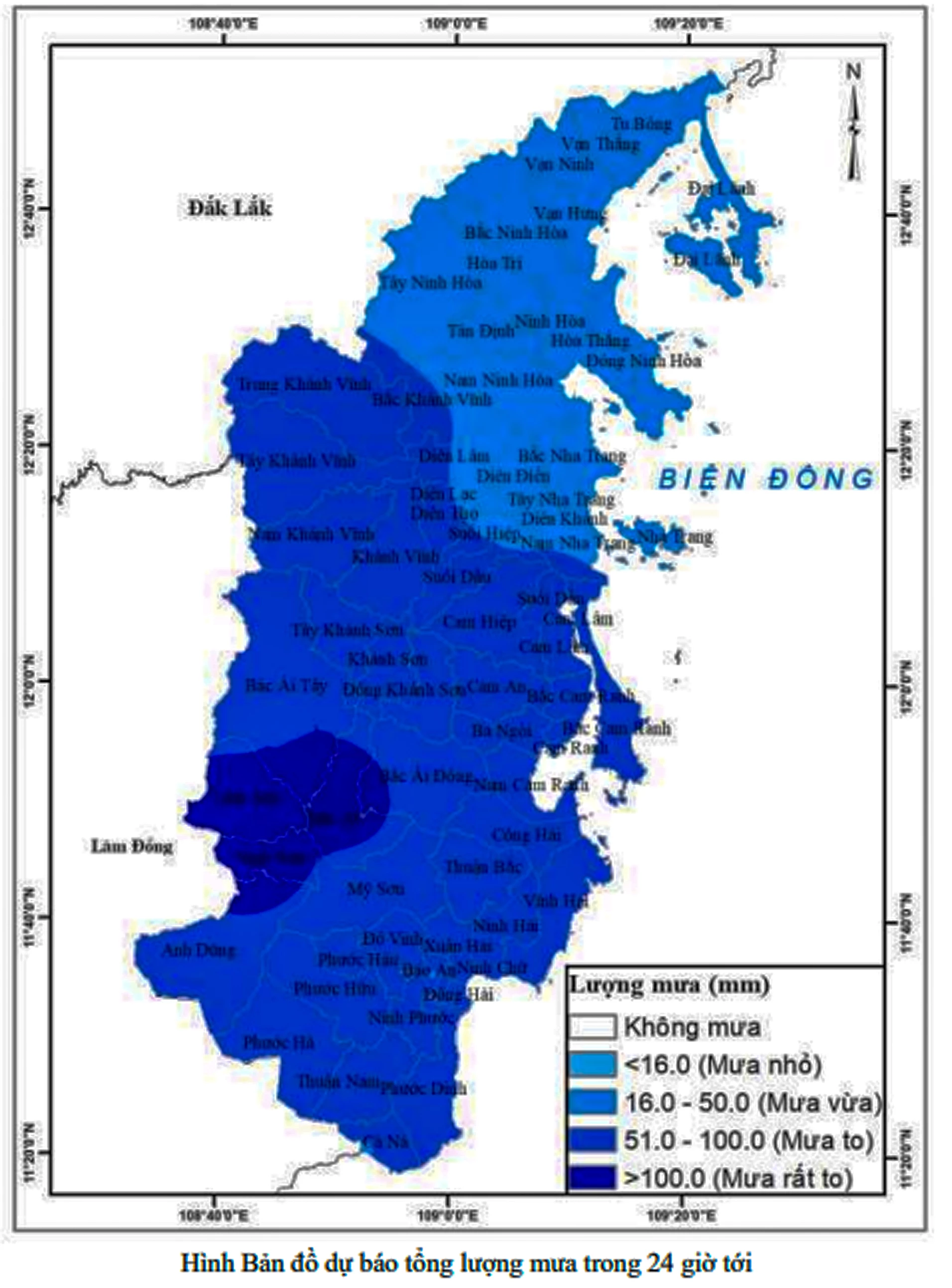 Cảnh báo nguy cơ ngập cục bộ một số vùng trũng thấp tại các xã, phường: Ninh Hòa, Nam Ninh Hòa, Đông Ninh Hòa, Tân Định, Hòa Trí, Hòa Thắng, Diên Khánh, Suối Hiệp, Diên Điền, Bắc Nha Trang, Nha Trang, Tây Nha Trang, Nam Nha Trang, Phan Rang, Bảo An, Phước Dinh, Phước Hậu, Phước Hữu, Ninh Phước, Thuận Nam, Cam Ranh....