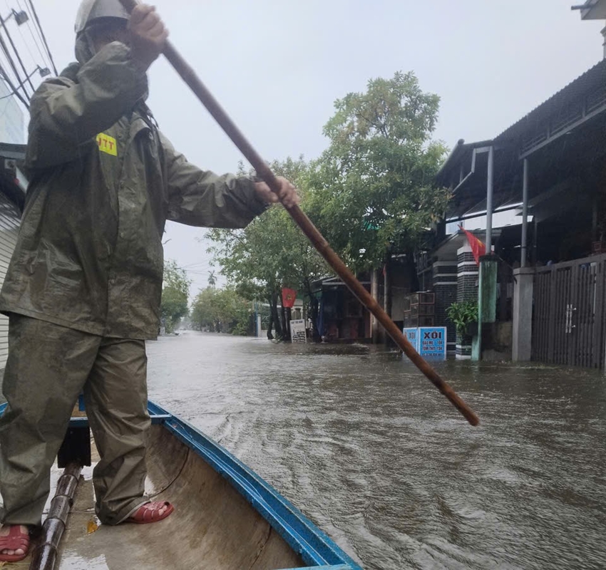 Lực lượng xung kích phường Hóa Châu di chuyển bằng ghe vào vùng ngập sâu để hỗ trợ người dân.