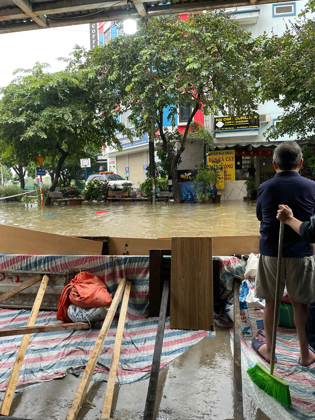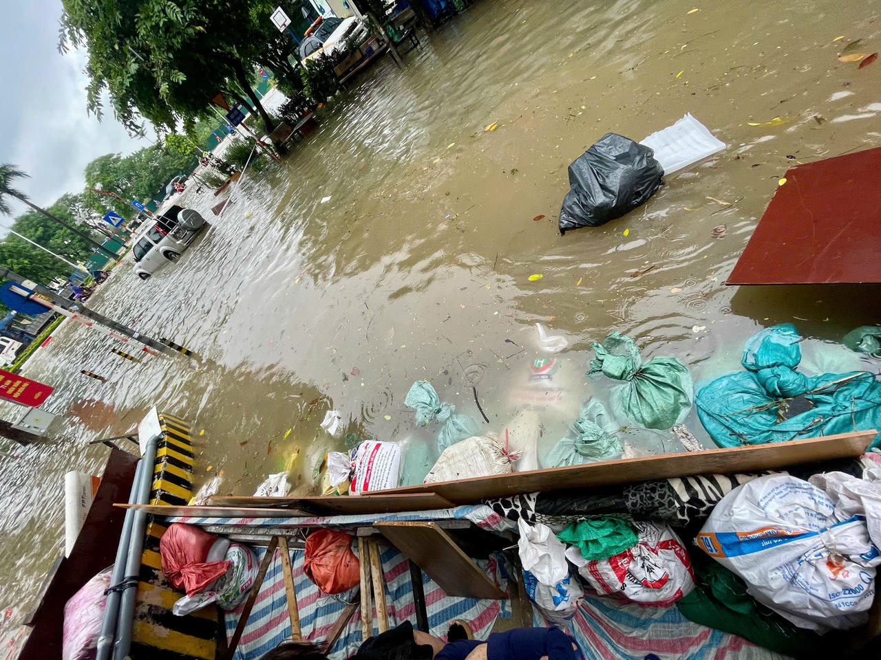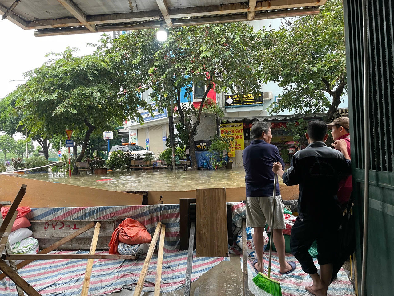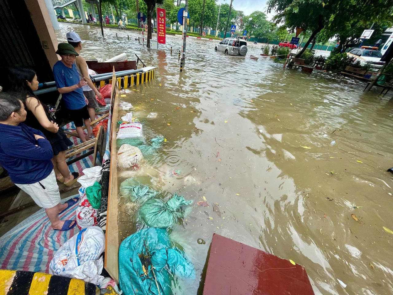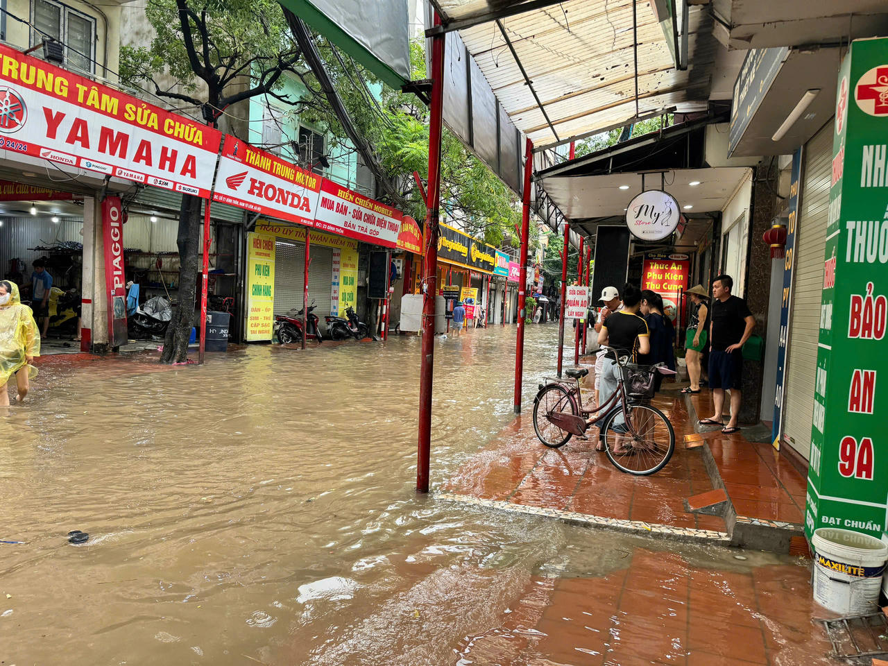 Không chỉ tại các hầm để xe, tại phố Đình Thôn, nước còn tràn vào tận cửa nhiều nhà dân. Nhiều hộ phải dùng gạch, các tấm ván để chắn trước cửa ngăn nước, song mỗi xe có xe ô tô đi qua, sóng nước lại dâng lên, tràn vào nhà. Một số cửa hàng kinh doanh phải tạm ngừng hoạt động, hàng hóa được kê cao tránh hư hại...