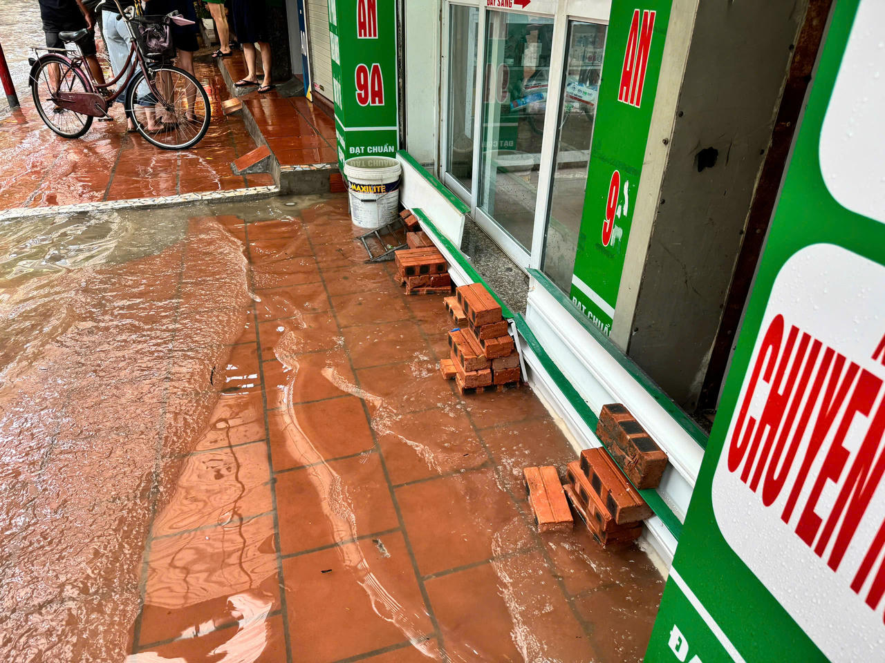 Một hiệu thuốc trên phố Đình Thôn phải dùng gạch chặn ngăn nước tràn vào cửa hàng.