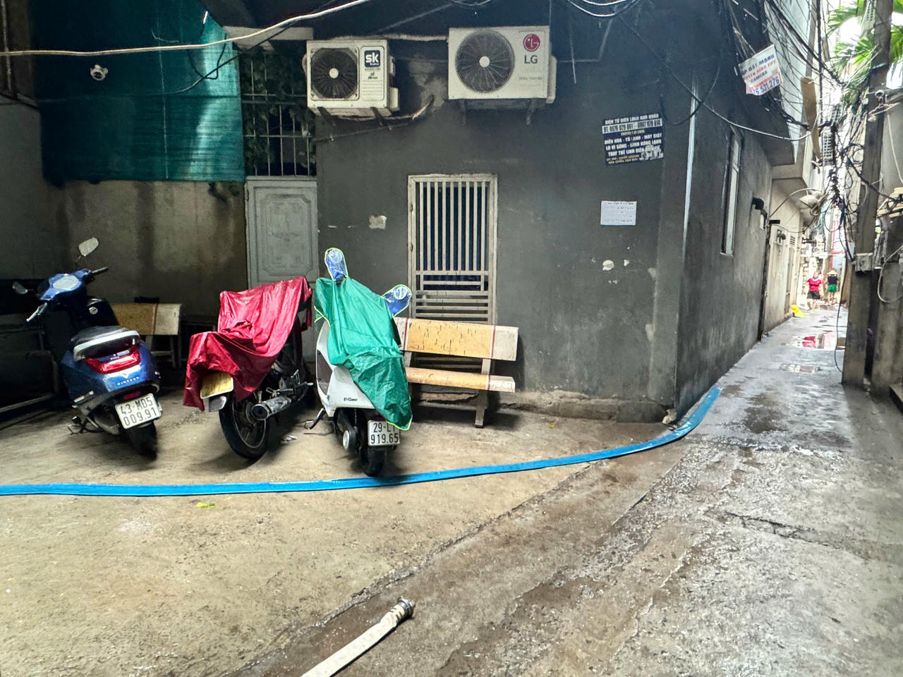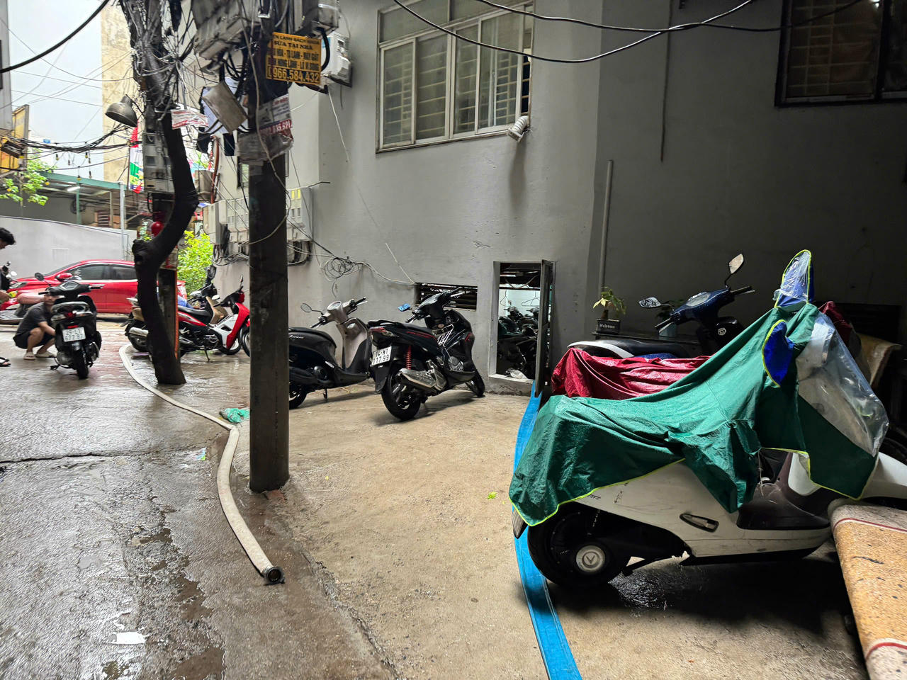Tương tự tại một chung cư mini trên phố Đình Thôn (phường Từ Liêm), mưa to đã khiến nước nhanh chóng tràn vào hầm để xe của tòa nhà. Từ sáng sớm, người dân đã cùng bảo vệ phải khẩn trương 'sơ tán' toàn bộ xe máy lên khu vực cao để tránh nước; đồng thời dùng máy bơm để hút nước ra khỏi hầm để xe.