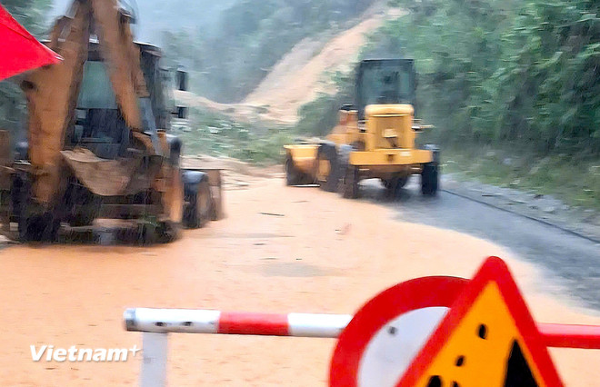 Sạt lở làm ách tắc hoàn toàn tuyến đường Hồ Chí Minh đoạn qua xã Phước Năng, Đà Nẵng. (Ảnh: PV/Vietnam+)