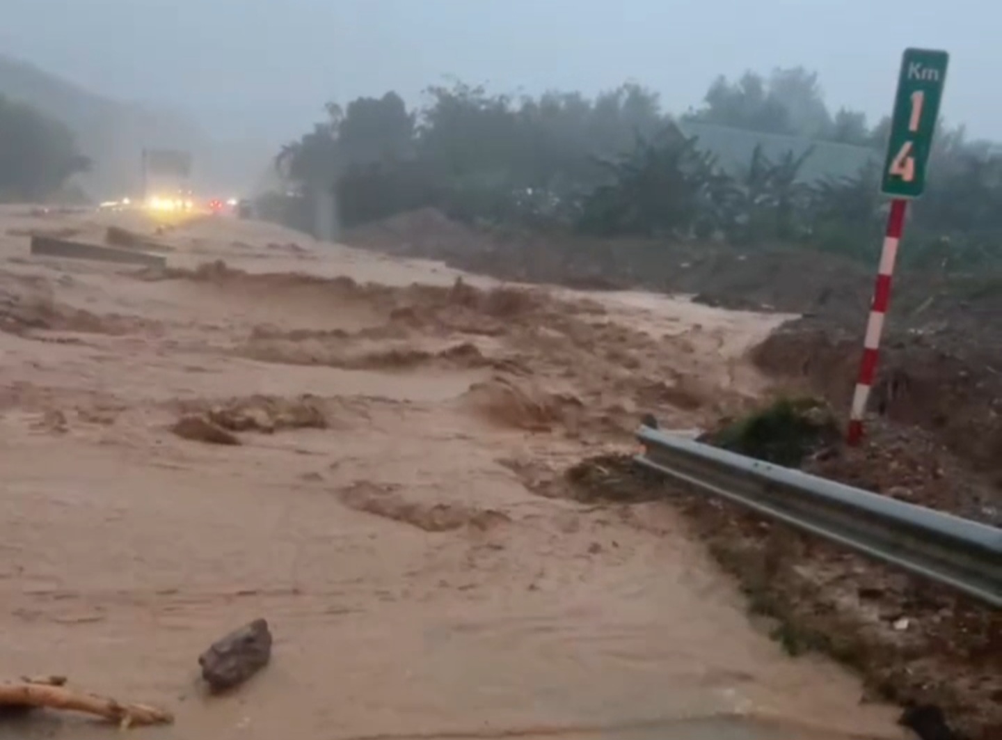 * Khoảng 4 giờ 30 phút sáng 27-10, tại Km12 đường cao tốc La Sơn - Túy Loan xảy ra vụ sạt lở đất đá, khiến một ô tô bị trôi khoảng 20m.