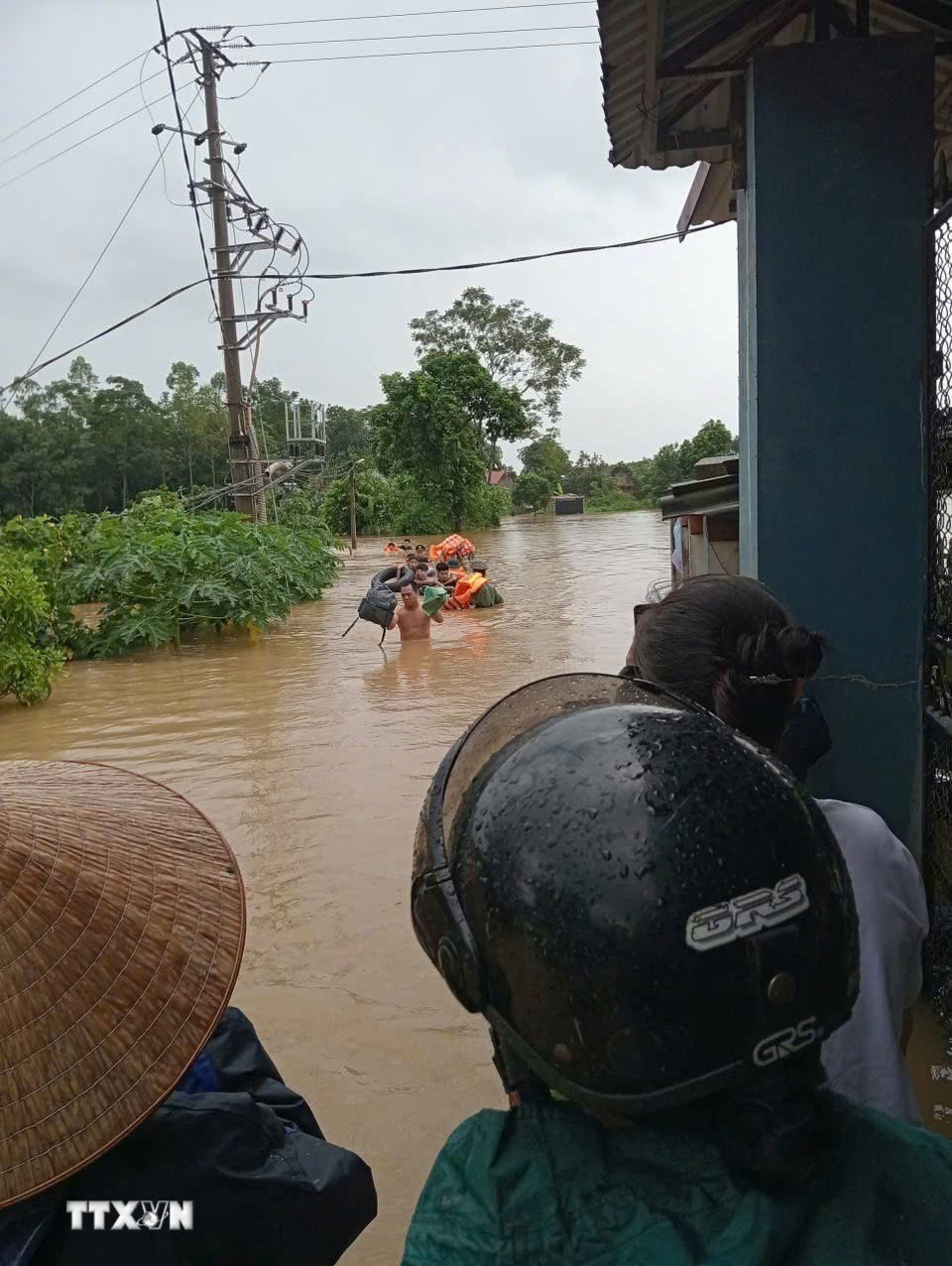 Lực lượng chức năng hỗ trợ nhân dân thôn Chẽ, xã Yên Thế sơ tán tài sản, vật nuôi, phòng tránh mưa bão. (Ảnh: TTXVN phát)