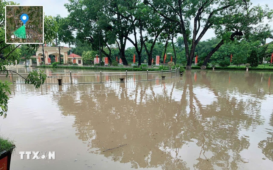 Nhiều nơi thuộc thôn Hoàng Hoa Thám, xã Yên Thế bị ngập sâu trong nước lũ. (Ảnh: TTXVN phát)