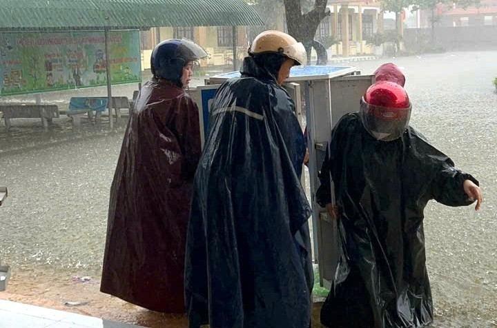 Giáo viên ở xã Quảng Trạch, Quảng Trị, di chuyển tài sản lên cao tránh hư hỏng khi nước lũ đã tràn vào sân trường hôm 31/10. (Ảnh: HƯƠNG GIANG)