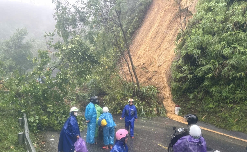 Sạt lở, gây ách tắc giao thông tại Quốc lộ 49 qua xã A Lưới 5. Ảnh: Văn Hải