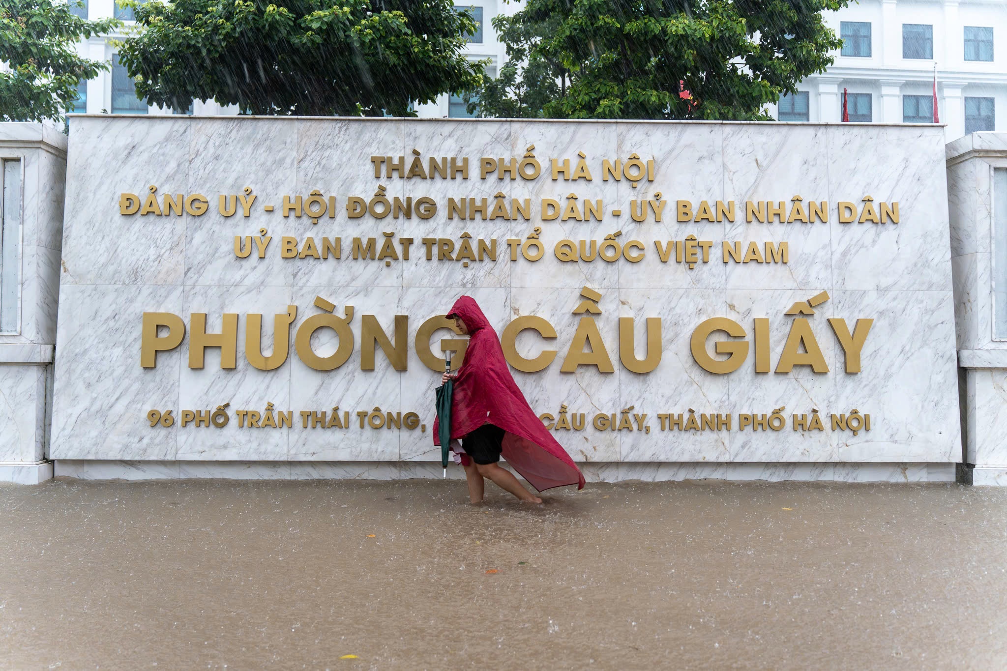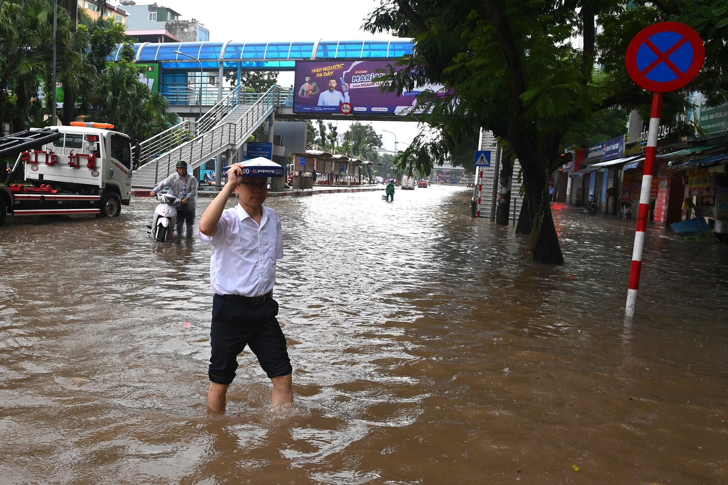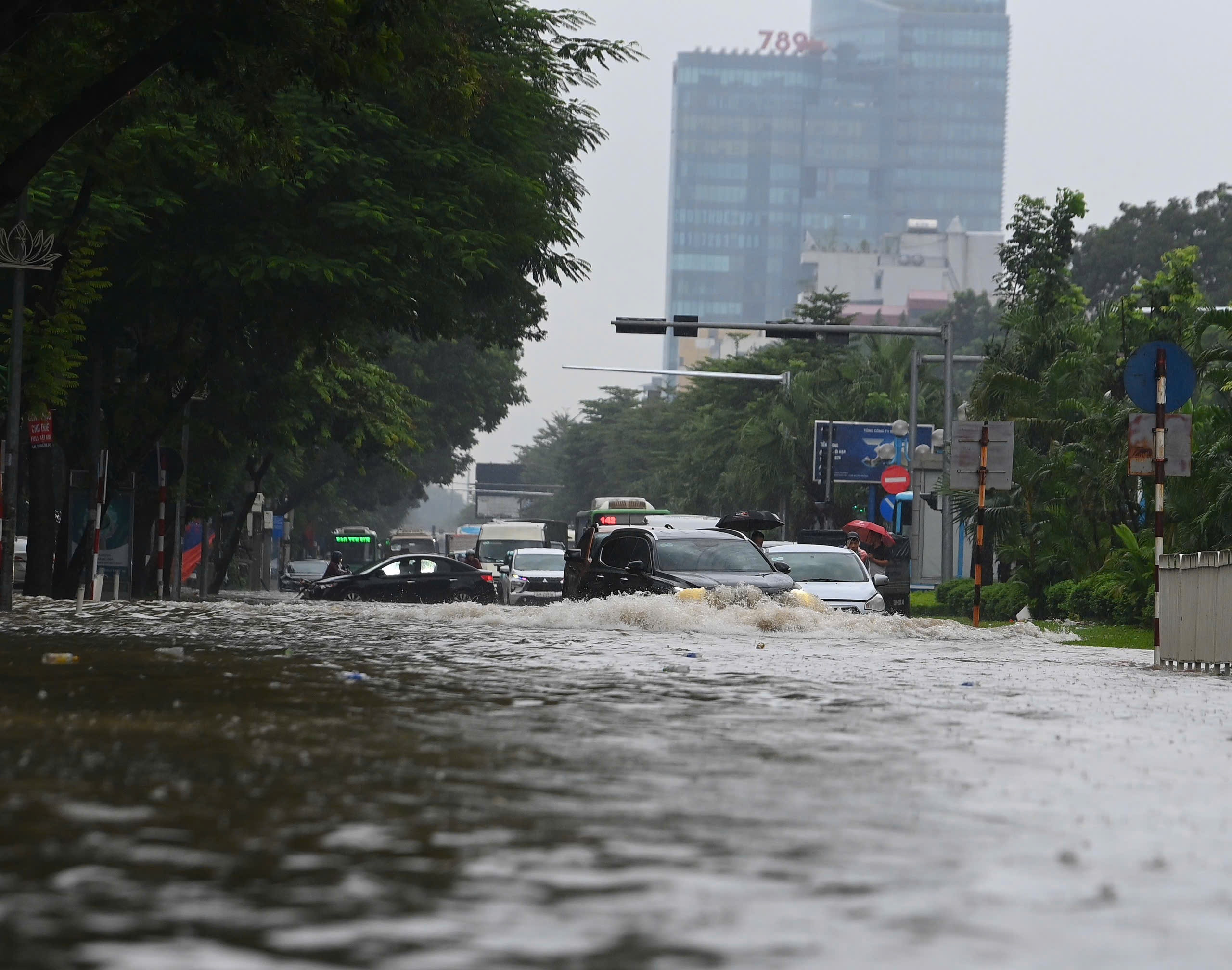 Tại phường Cầu Giấy, các con đường như Trương Công Giai, Trần Thái Tông, Thành Thái bắt đầu ngập từ sáng 7/10. Khu vực Phạm Hùng - Dương Đình Nghệ đã xuất hiện một số phương tiện chết máy do ngập nước. Ảnh: Trần Hiền.