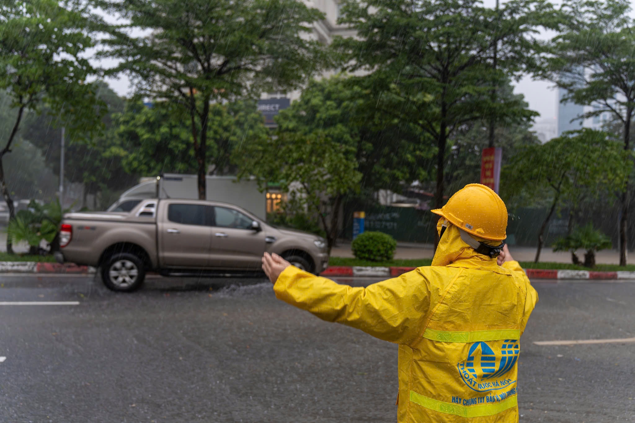 Nhân viên công ty cấp thoát nước đã nhanh chóng có mặt tại một số tuyến đường ngập ở phường Cầu Giấy để ứng phó tình hình, hướng dẫn phương tiện không di chuyển vào điểm ngập. Ảnh: Trần Hiền.