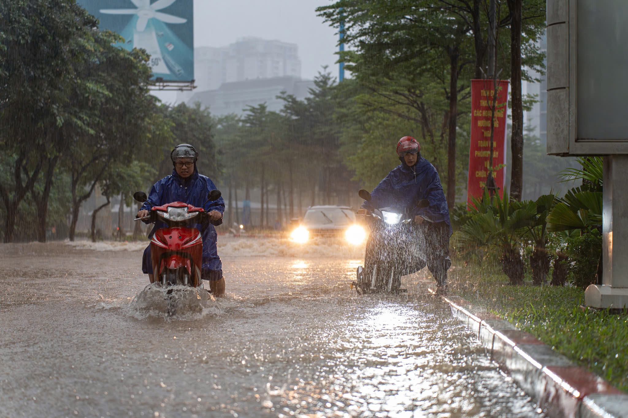Thời điểm 8h sáng mưa lớn vẫn tiếp tục đổ xuống khu vực trung tâm Hà Nội, trời vẫn tối đen nhiều phương tiện phải bật đèn pha để di chuyển. Ảnh: Việt Linh.