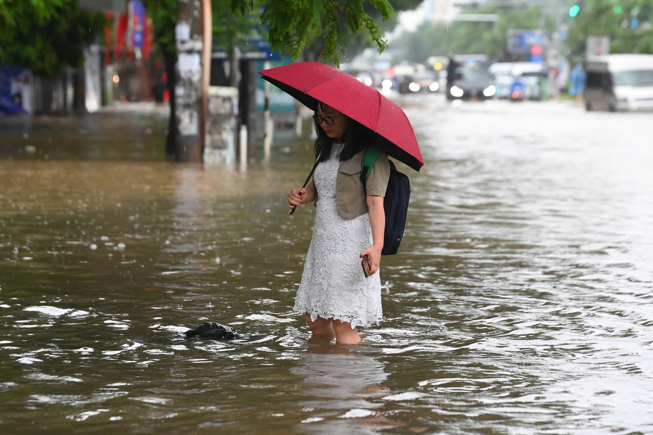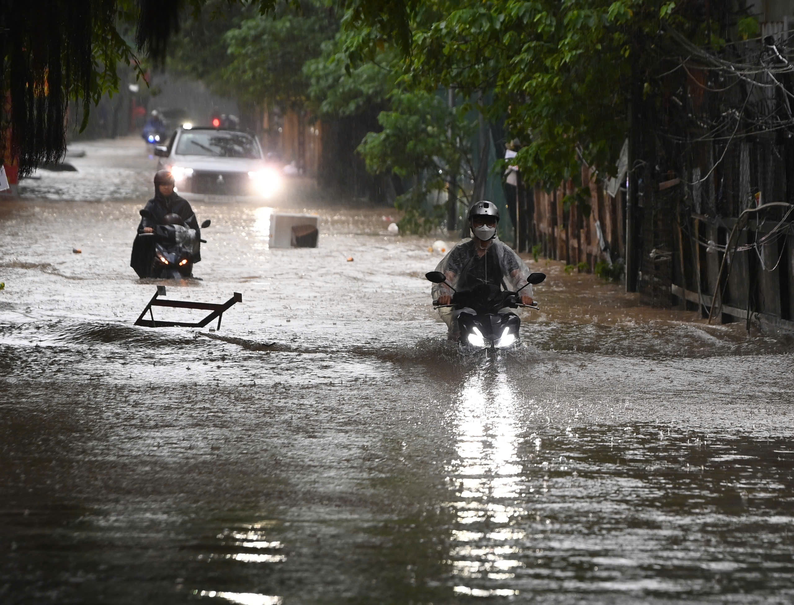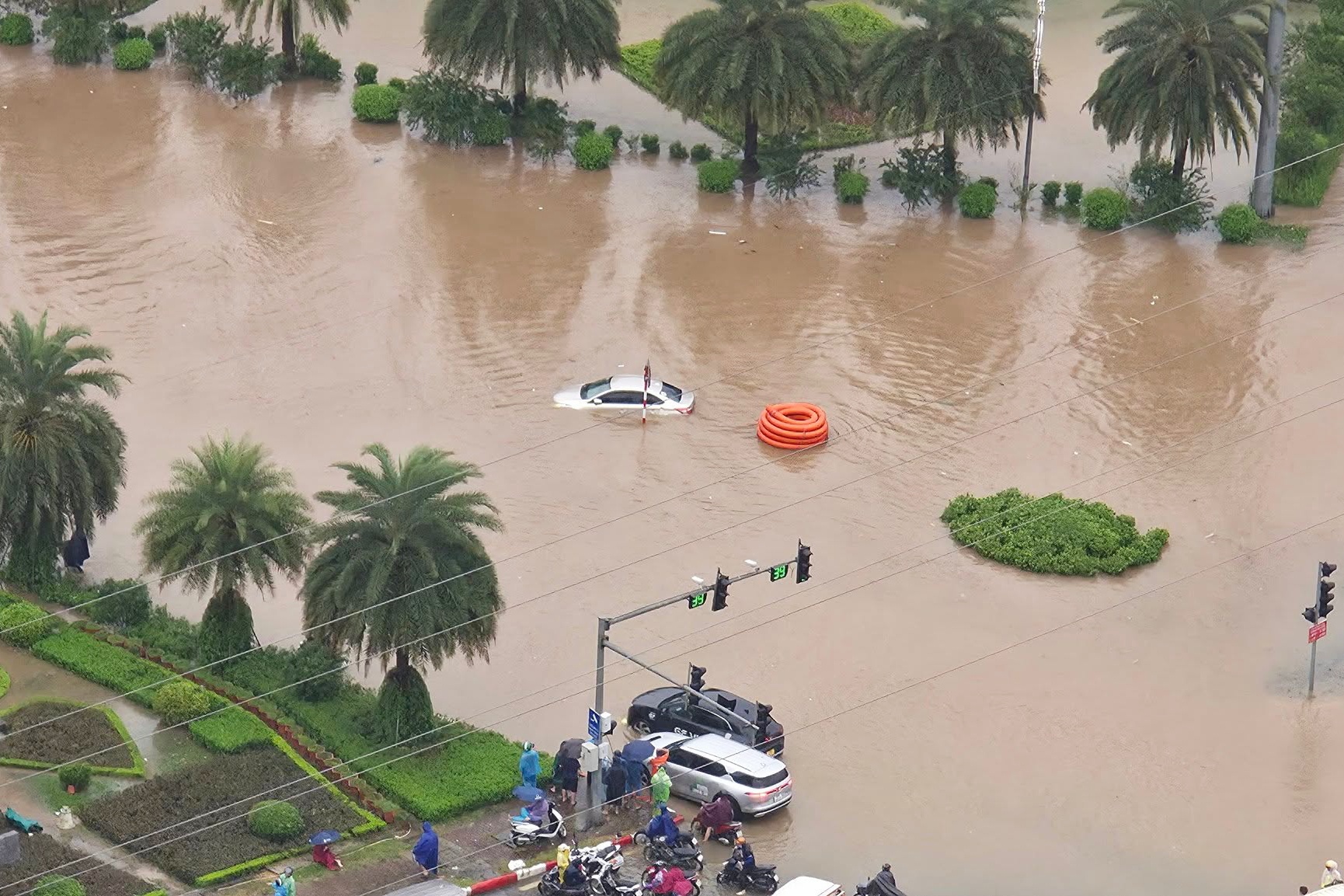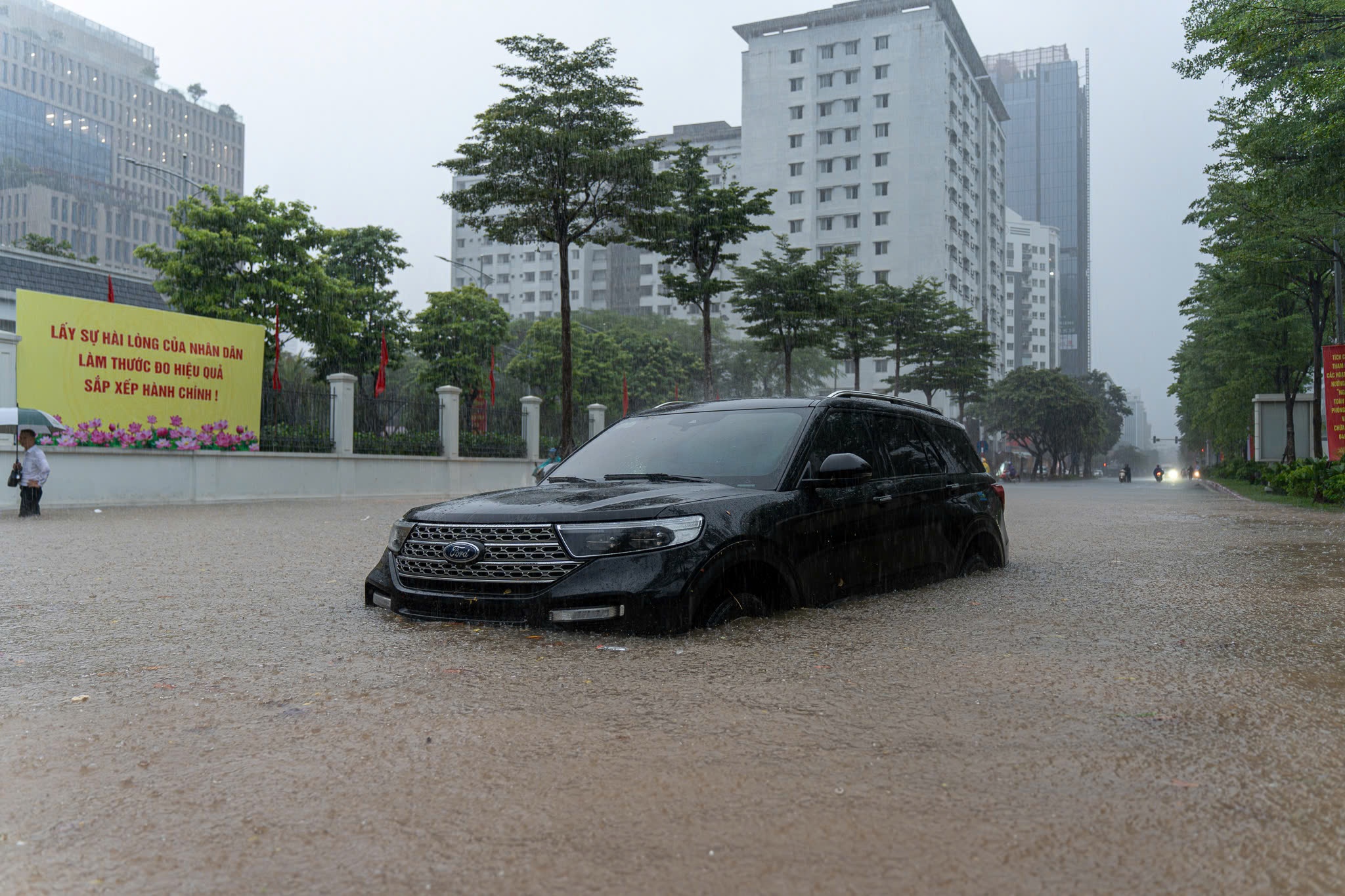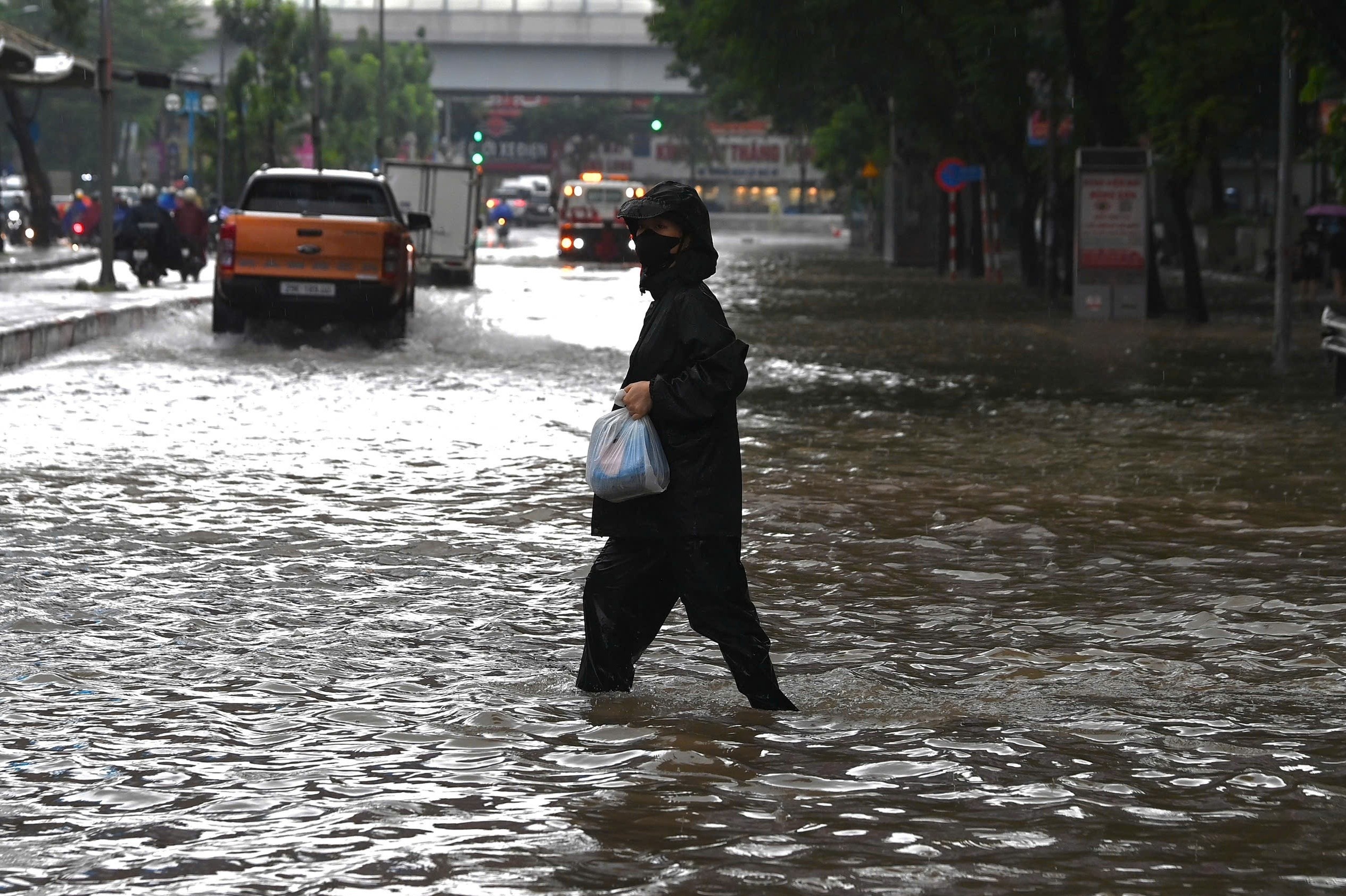 Một chiếc ôtô bị chết máy trước giao lộ, mực nước đã ngập quá bánh xe. Theo Trung tâm Khí tượng Thủy văn Quốc gia, lượng mưa 6 giờ qua phổ biến từ 40 tới 80 mm, có nơi cao hơn như trạm Sóc Sơn 116 mm, trạm Thượng Cát 91 mm... Ảnh: Phạm Ngọc Linh.