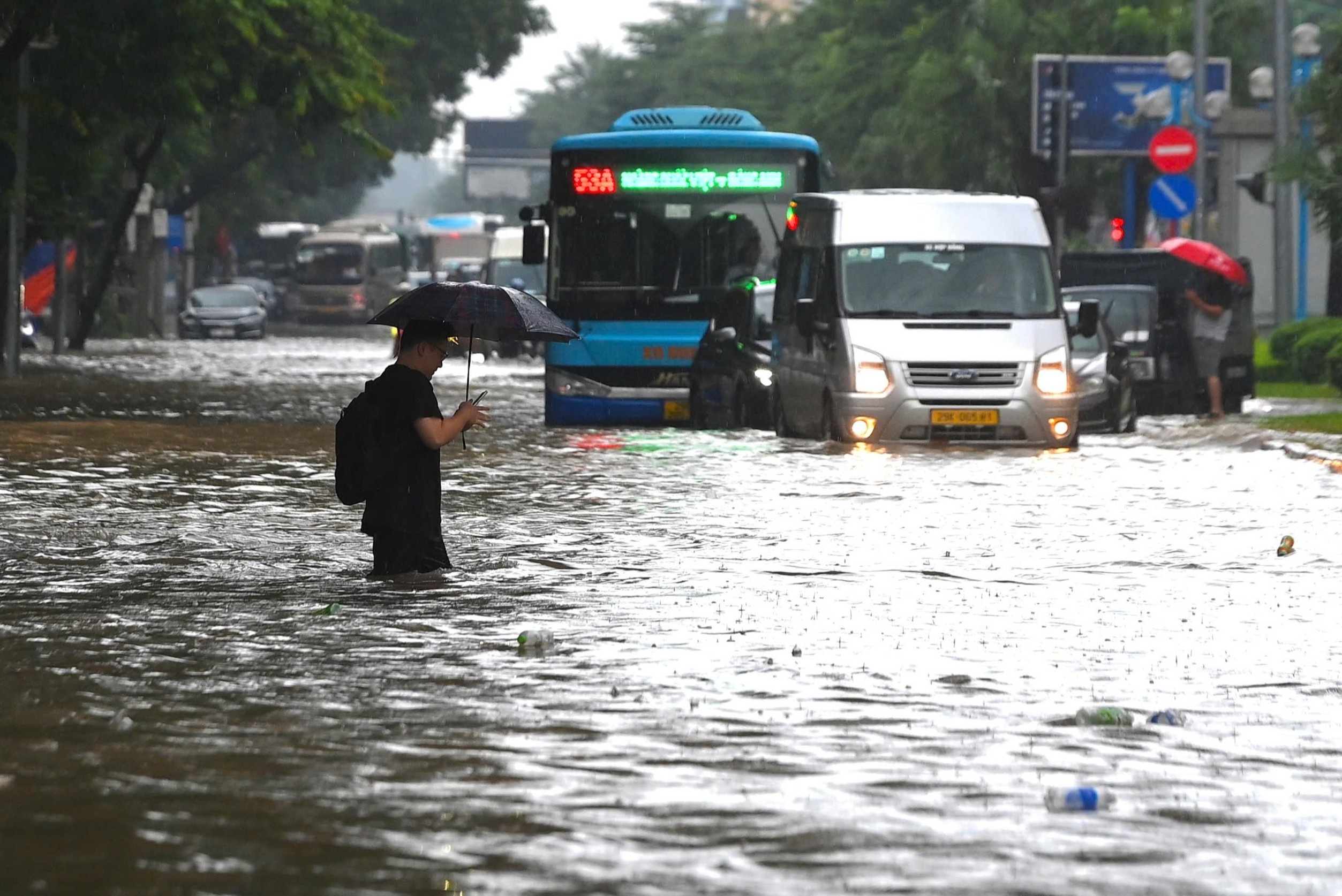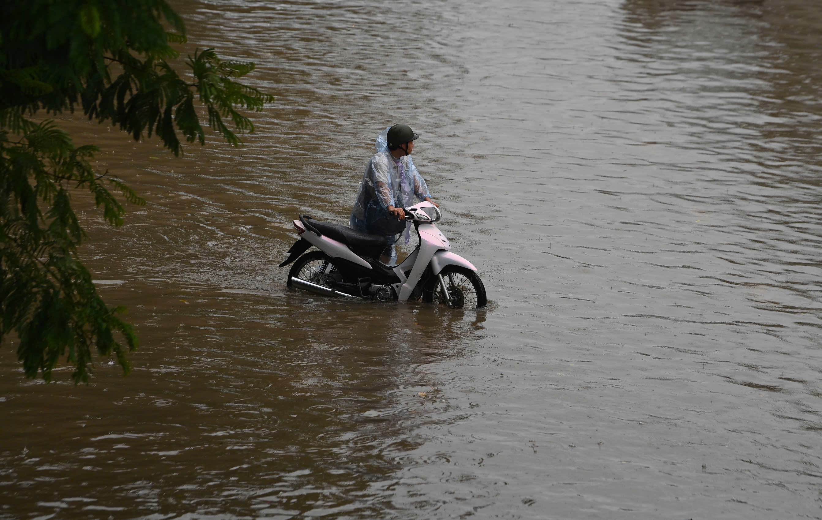 Ghi nhận lúc 7h sáng tại đường Nguyễn Trãi, đoạn gần ngã tư Khuất Duy Tiến ngập sâu khiến các phương tiện lưu thông khó khăn, giao thông tê liệt. Dự báo trong sáng 7/10, Hà Nội tiếp tục có mưa vừa, mưa to và dông, từ chiều tối và đêm mưa giảm nhanh. Ảnh: Việt Hà.