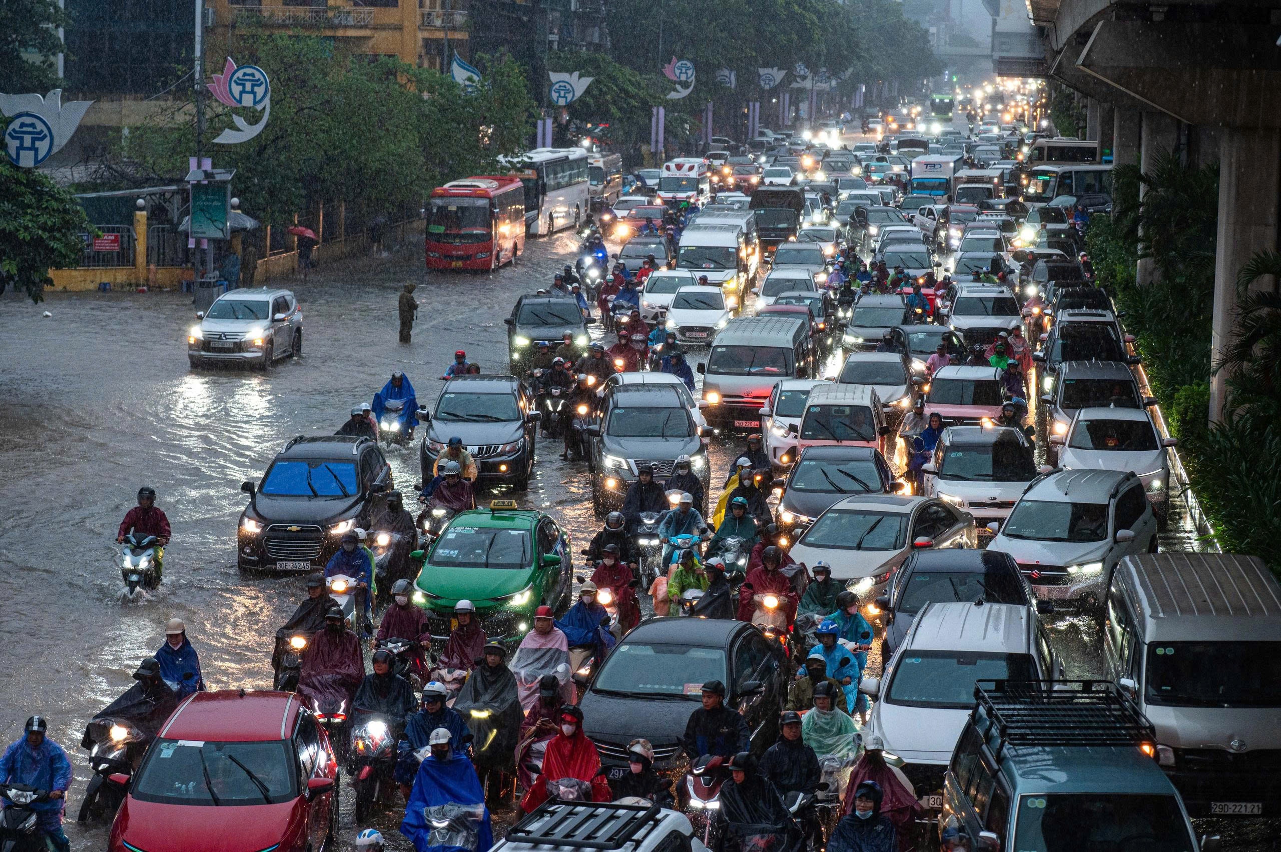 Vào khoảng 8h30 sáng 7/10, đoạn đường Trần Duy Hưng - đại lộ Thăng Long - Khuất Duy Tiến ách tắc do nhiều đoạn đường đã ngập sâu, khiến việc đi lại khó khăn. Hàng trăm phương tiện dừng lại ở khu vực đường chưa ngập nước, chần chừ di chuyển vì sợ xe chết máy. Ảnh: Phạm Ngọc Linh.