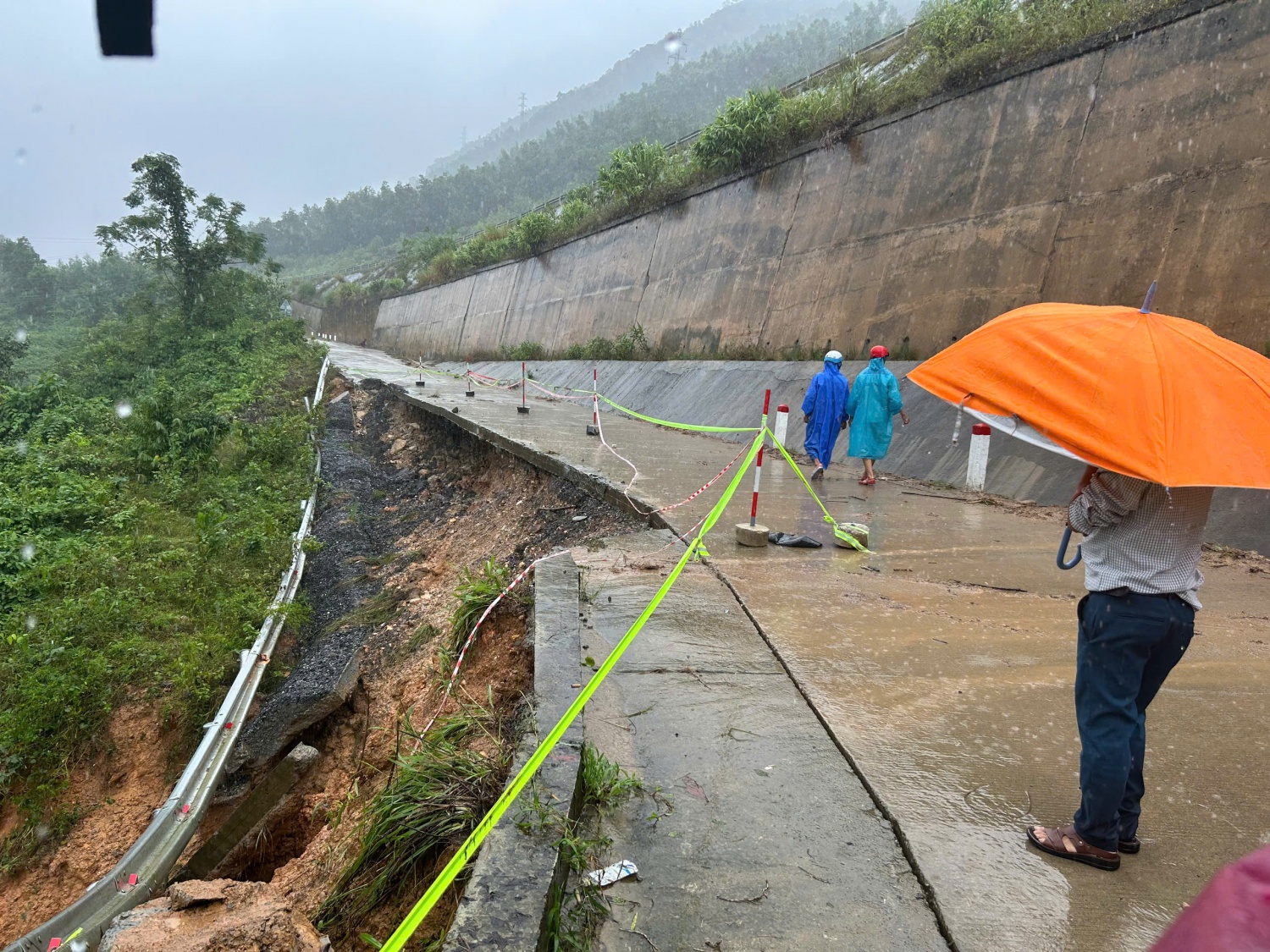 Đồng thời, mưa lớn cũng gây sạt lở, “cắt đứt” nhiều tuyến giao thông tại Đà Nẵng. Trong đó, một số tuyến đường đã bị hư hại như tuyến đường ĐT601 đoạn qua thôn Tà Lang, Giàn Bí (phường Hải Vân), tuyến cao tốc La Sơn - Túy Loan, QL 24C (đoạn qua thôn 2, xã Trà My hướng Quảng Ngãi)… Các tuyến quốc lộ như: 14B sạt taluy dương tại Km1+300 (trái tuyến) gây lấp rãnh, khối lượng khoảng 30m³; Quốc lộ 40B sụt lún, gãy đốt cống phía hạ lưu, hư hỏng hạ lưu cống tại Km72+585 và sạt lở taluy dương tại Km121+850 (trái tuyến), khối lượng khoảng 500m³.