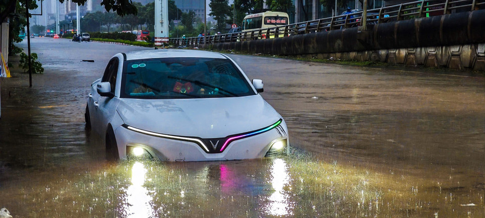 Hoàn lưu cơn bão số 11 (bão Matmo) gây mưa lớn từ nửa đêm đến sáng 7/10 làm hàng chục điểm trung tâm Hà Nội ngập sâu; Đài Khí tượng Thủy văn Bắc Bộ dự báo mưa rất to kèm giông sẽ kéo dài. (Ảnh: Hoài Nam/Vietnam+)