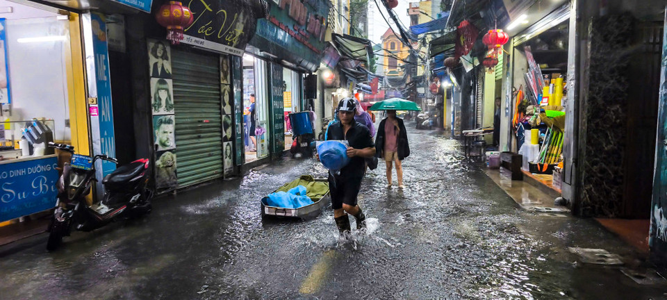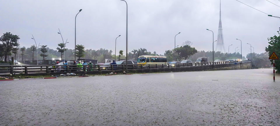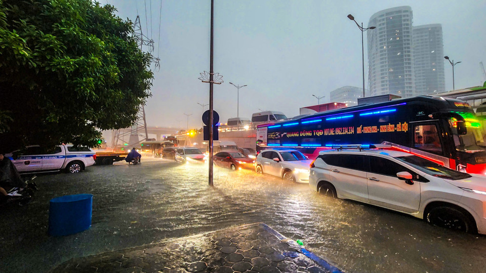 Từ 0 giờ ngày 7/10, tại Hà Nội bắt đầu xuất hiện mưa lớn kèm sấm chớp. Mưa lớn kéo dài từ giữa đêm đến sáng cùng ngày khiến nhiều tuyến phố bắt đầu ngập sâu. (Ảnh: Hoài Nam/Vietnam+)