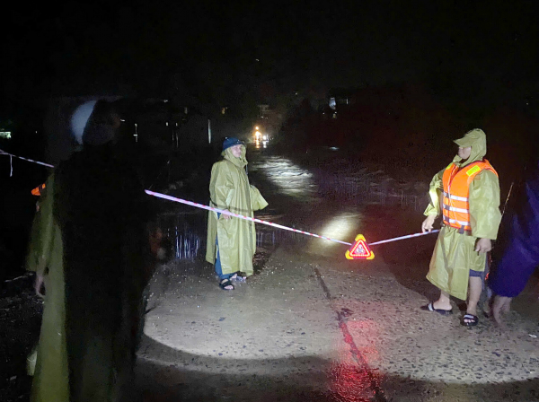 Các lực lượng xã Tây Khánh Sơn thường trực tại một điểm lũ lụt ngập tràn trên đường giao thông.