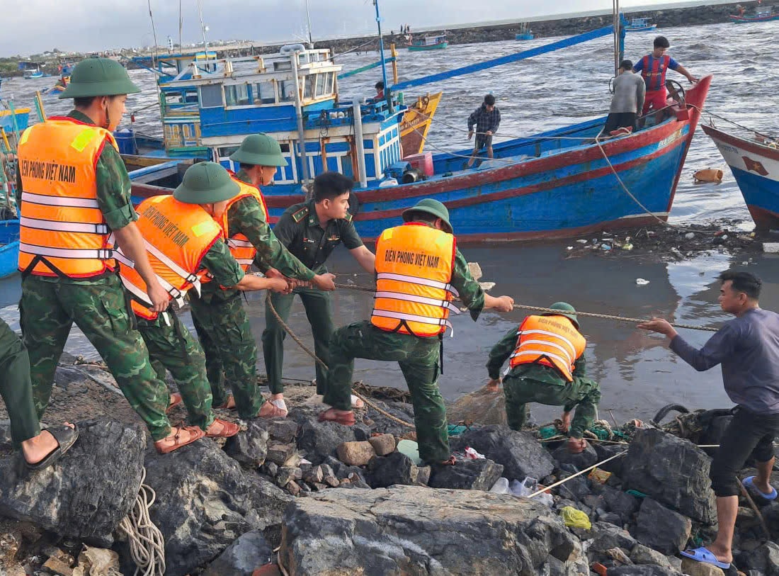 Cán bộ, chiến sĩ Đồn Biên phòng Liên Hương hỗ trợ ngư dân kéo, neo các phương tiện