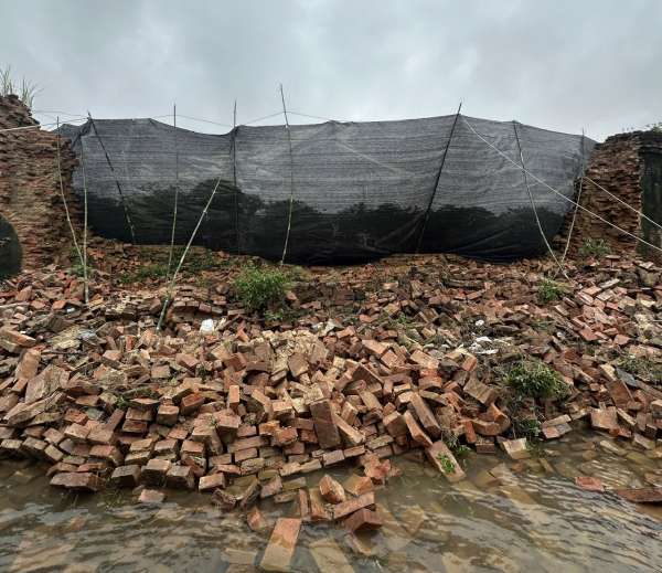 Phần tường bị sập gồm nhiều viên gạch vồ tách rời.