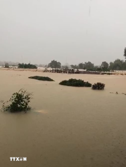 Nước ngấp nghé Trung tâm thương mại Hoàng Gia Plaza, phường Phan Đình Phùng. (Ảnh: Thảo Nguyên/TTXVN)