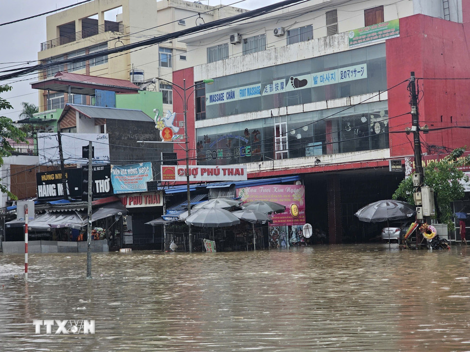 Chợ Phú Thái trên đường Quang Trung, phường Phan Đình Phùng bị ngập sâu. (Ảnh: Thảo Nguyên/TTXVN)