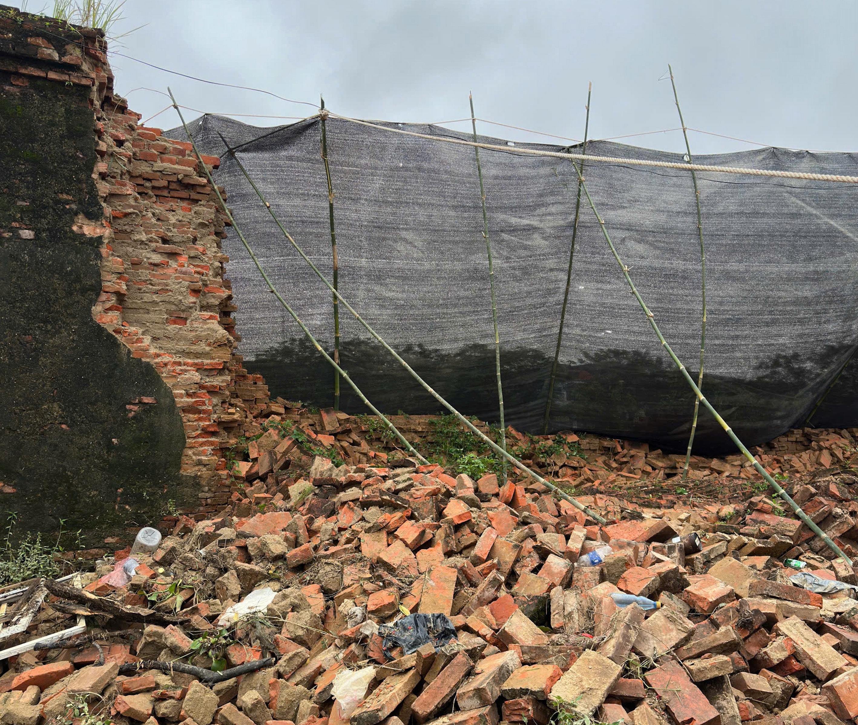 Sáng 3/11, Trung tâm mời đại diện Sở Xây dựng TP Huế khảo sát kiểm tra, đánh giá bước đầu sự cố trên. Theo ghi nhận trực quan, phần tường bị sập gồm nhiều viên gạch vồ tách rời, thiếu tính liên kết khối. Quan sát bằng mắt thường, tường được xây 3 lớp trong và ngoài xây bằng gạch vồ, lớp giữa độn bằng đất sét.