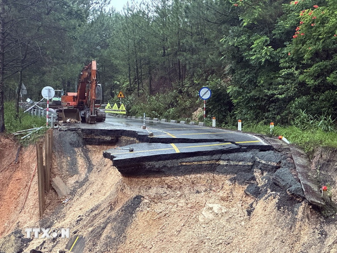 Lực lượng chức năng bố trí phương tiện tại khu vực sụt lún trên đèo Mimosa. (Ảnh: Chu Quốc Hùng/ TTXVN)