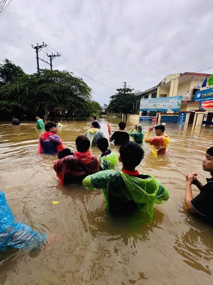 Nước lũ ngập đến ngang người các em học sinh ở Thái Nguyên - Ảnh: Hội sinh viên Việt Nam