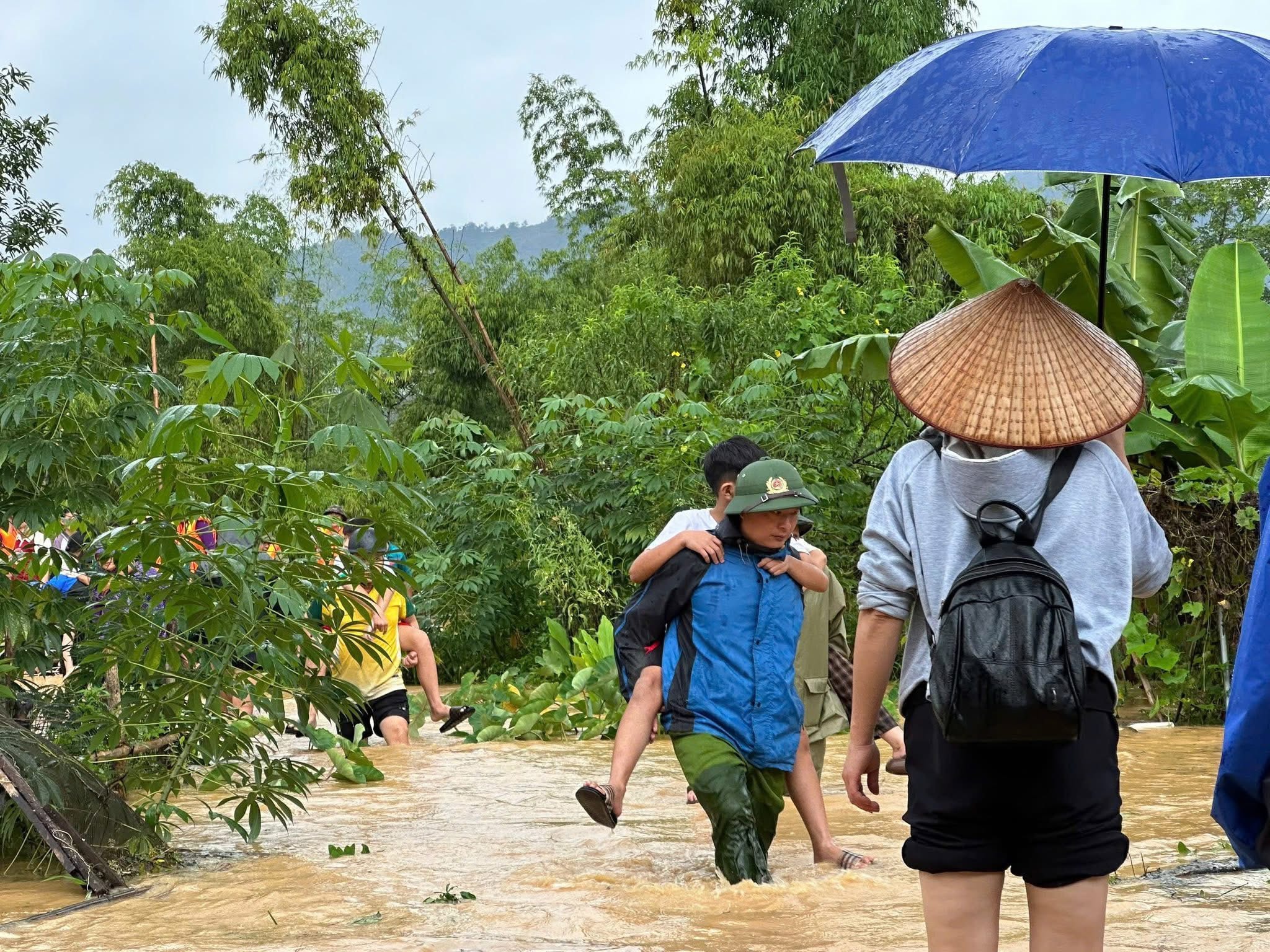 Cán bộ hỗ trợ đưa các em học sinh di dời khỏi khu vực nước lũ dâng cao. Ảnh: Trang TTĐT xã Na Rì