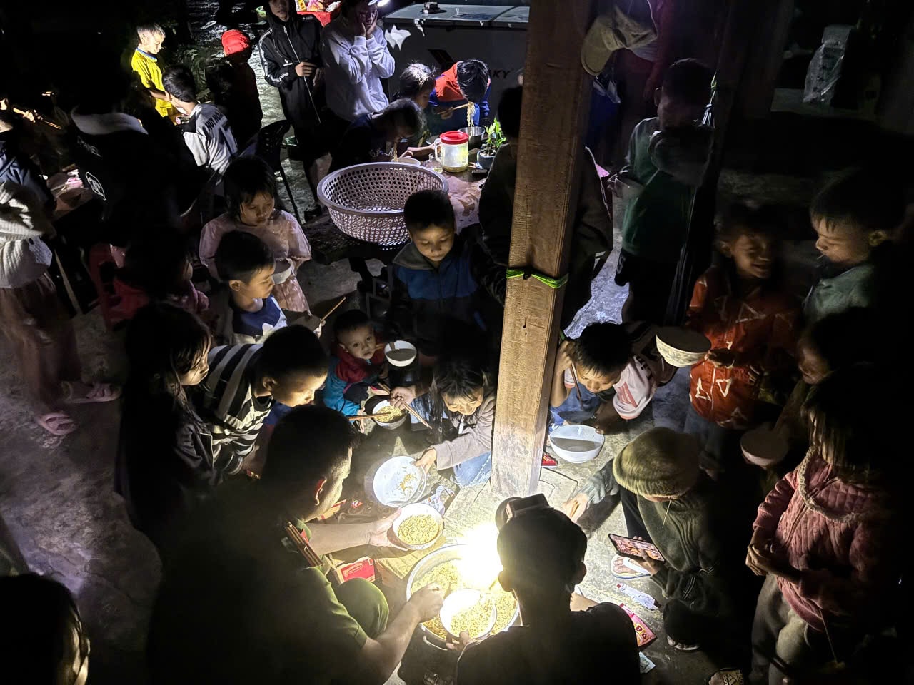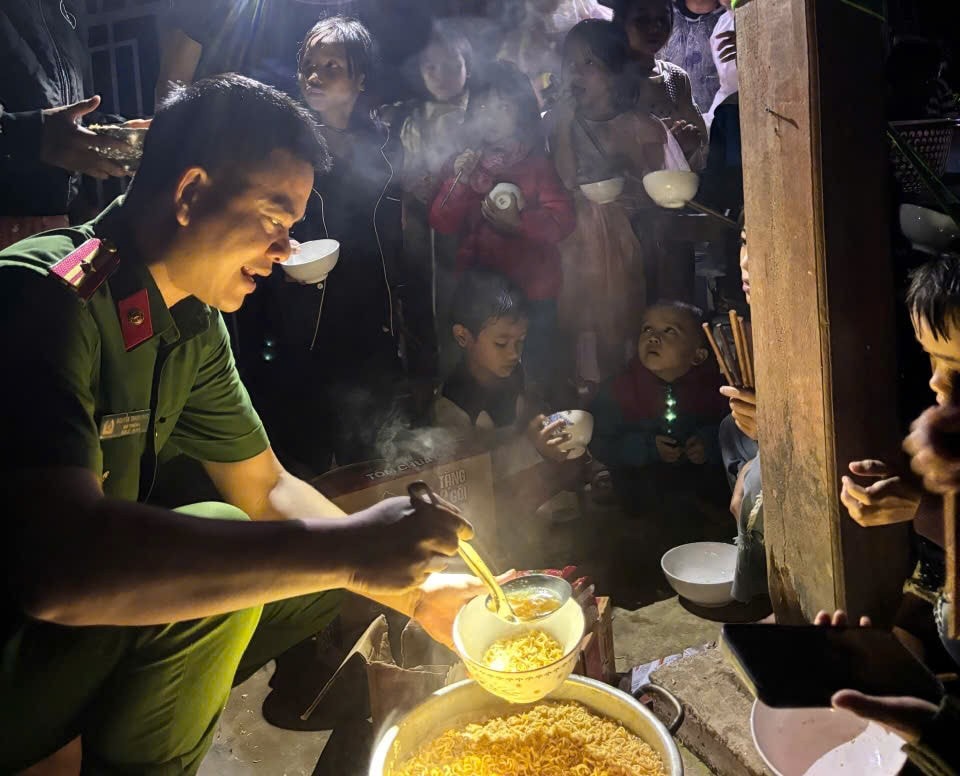Chiều 26-10, mưa lũ tiếp tục diễn biến xấu khiến gần 200 người dân tại thôn 1 xã Trà Leng phải đi sơ tán gấp và đã đến nơi an toàn vào tối cùng ngày. Cán bộ, chiến sĩ công an xã Trà Leng cùng nhau vào bếp nấu mì tôm để đồng bào ăn ấm bụng, ngủ an toàn.