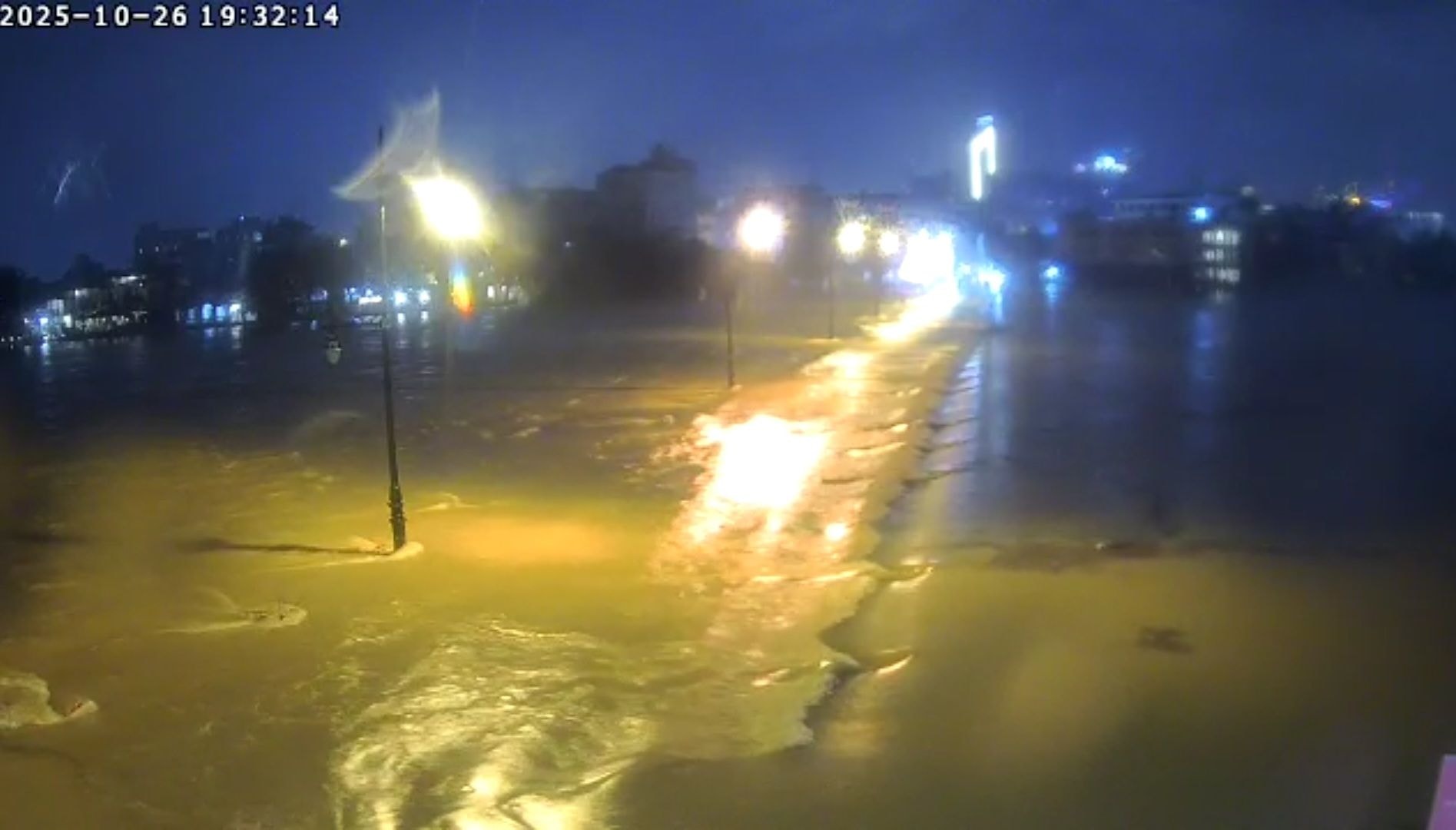 Nước lũ đã tràn qua Đập Đá tại trung tâm thành phố Huế tối 26-10. Ảnh: Hue-S.