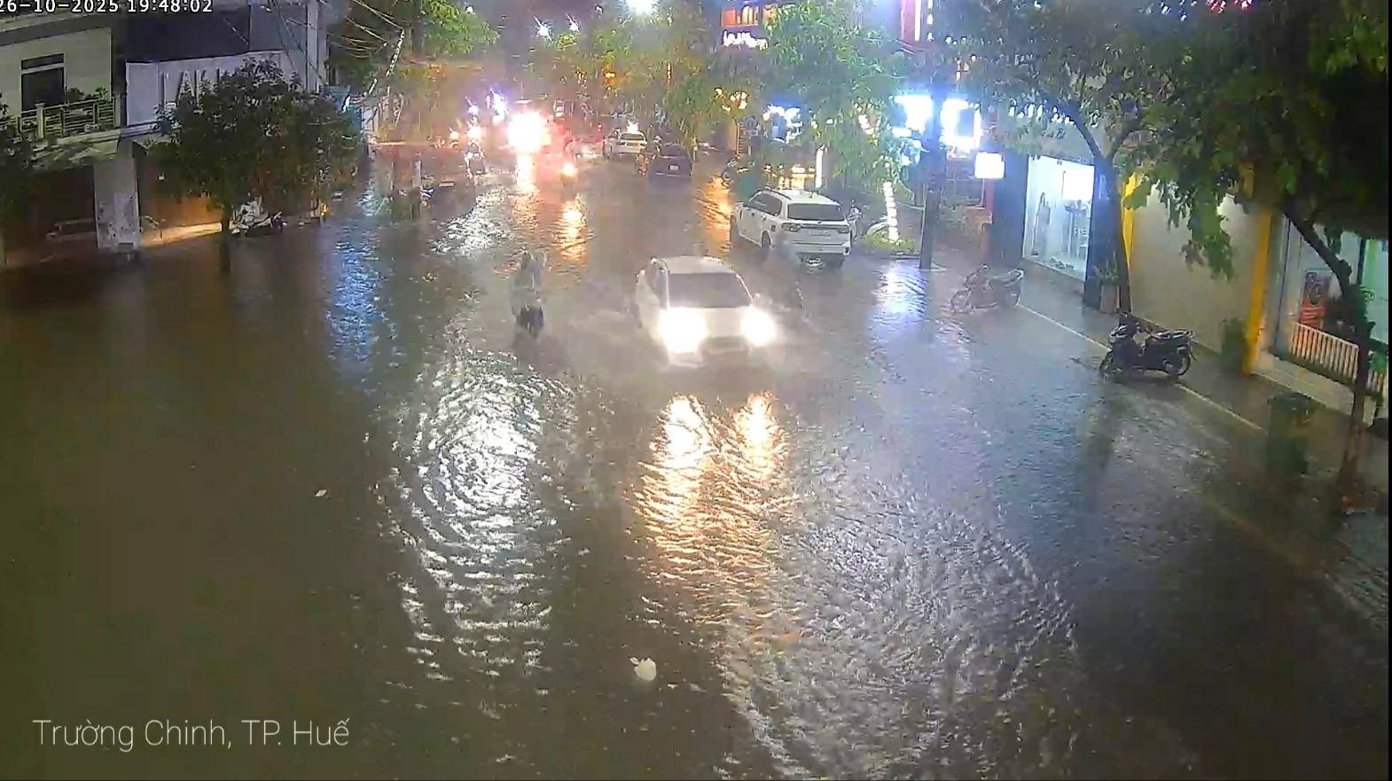 Nước đã tràn lên mặt đường Trường Chinh ở trung tâm thành phố Huế tối 26-10. Ảnh: Hue-S.