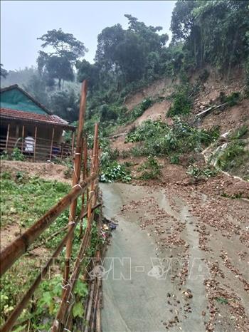 Sạt lở đất gây hư hại một số công trình nhà ở ông Hồ Văn An, đội 4 Trà Ôi xã Tây Trà. Ảnh: TTXVN