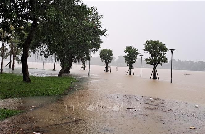 Lũ lên trên báo động 2 gây ngập đường đi bộ ven bờ Nam sông Hương, thành phố Huế. Ảnh: Nguyên Lý/TTXVN