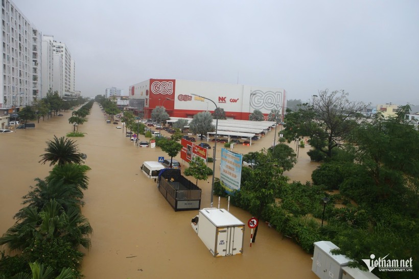 Tại phường Tây Nha Trang (Khánh Hòa) lũ lớn đột ngột khiến loạt ô tô bị nước nhấn chìm. Ảnh: Vietnamnet.